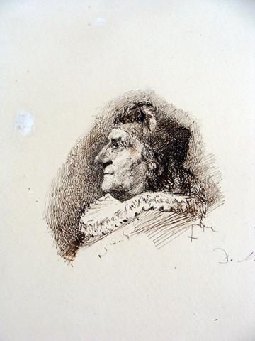 Obra de formato rectangular en orientación vertical. Dibujo figurativo, monocromático, que ocupa sólo la parte central del papel; se representa el retrato de perfil de un caballero burgués. Éste, de nariz pronunciada y leve sonrisa, tiene una gorgera circundado de su cuello. Fondo blanco.