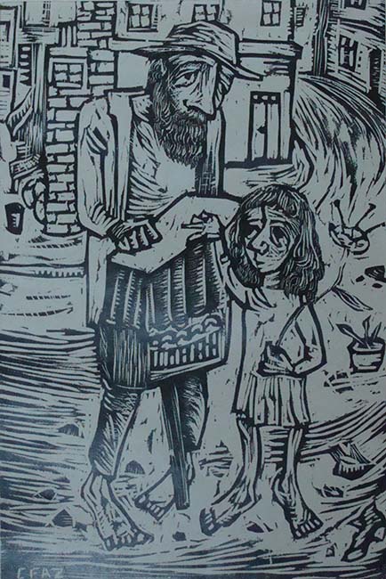 Obra de formato rectangular en orientación vertical. Grabado monocromo figurativo que representa una escena de exterior, al centro se encuentran un hombre adulto junto a una niña. El hombre con sombrero y descalzo sostiene una caja mientras la niña apoya su mano en la parte superior. El contexto de la obra es una calle urbana.