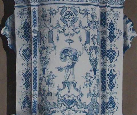 Obra de formato rectangular en orientación vertical. Grabado figurativo policromático que representa una fuente de formato cilíndrico con estructura no restringida y perfil con diversas molduras en sentido vertical y horizontal. El objeto decorado con diseños en tono azul cuenta con una tapadera y perilla circular en la zona superior, destacan, dos retratos en relieves a los costados.