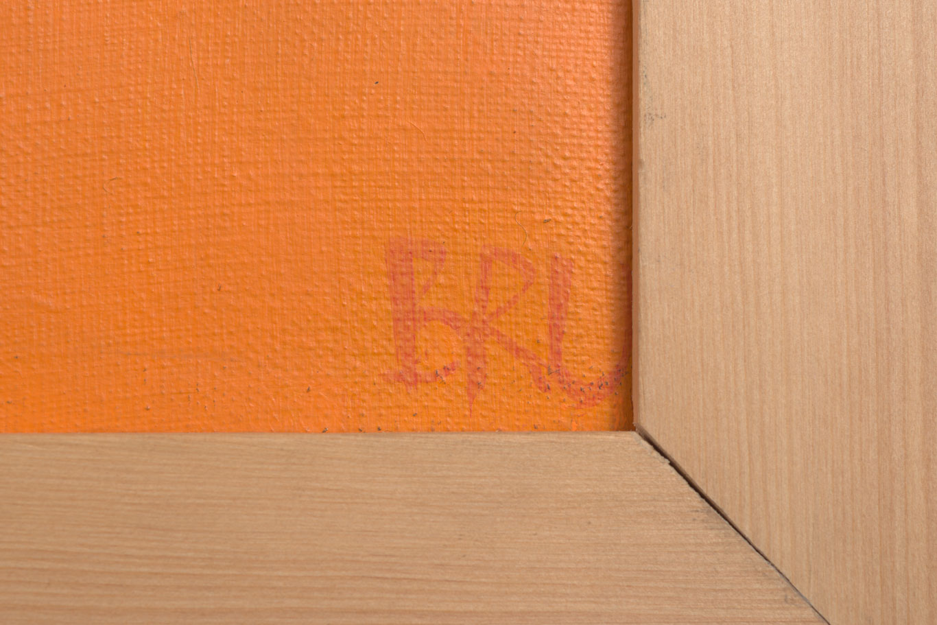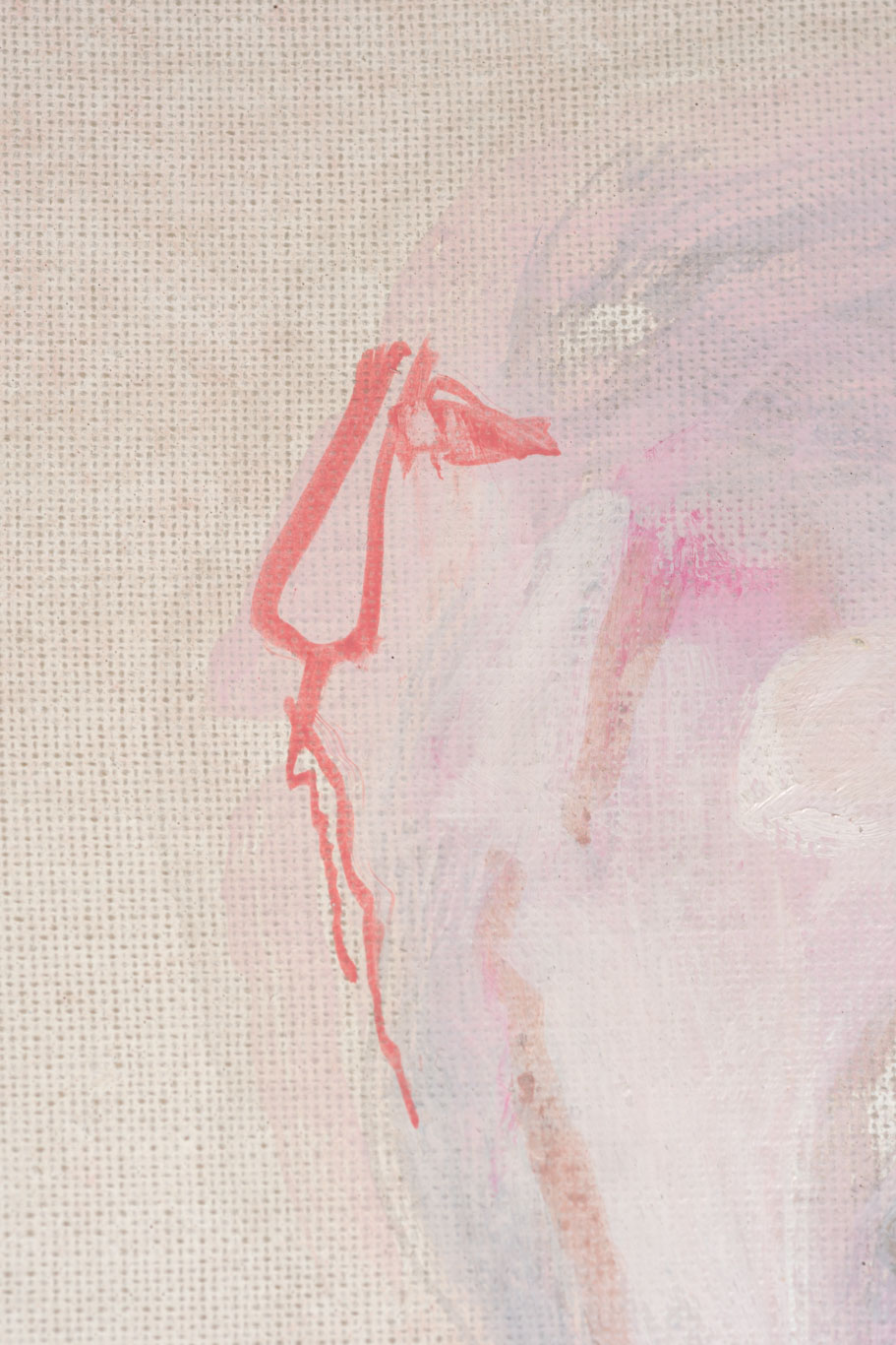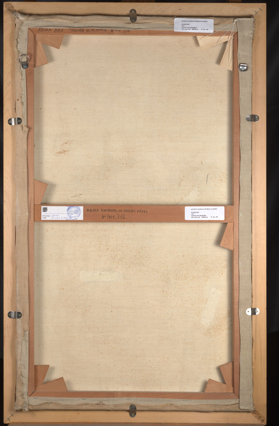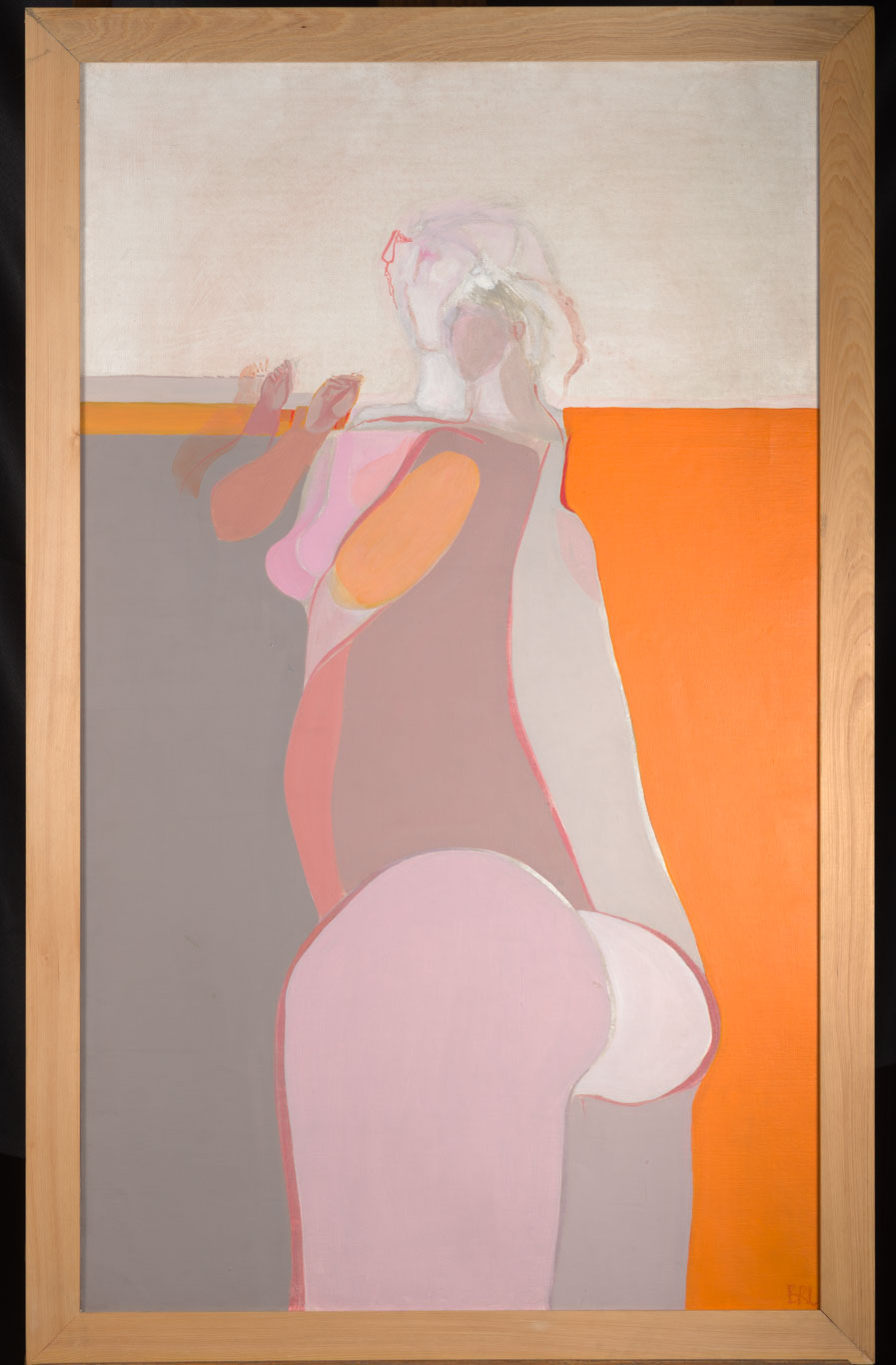 Obra rectangular de orientación vertical. Composición figurativa en base a figura femenina de perfil en tonos rosados y grises, dispuesta en el centro de la composición. El fondo se encuentra dividido en tres secciones. La parte superior es gris claro, la izquierda gris medio y la derecha anaranjado.