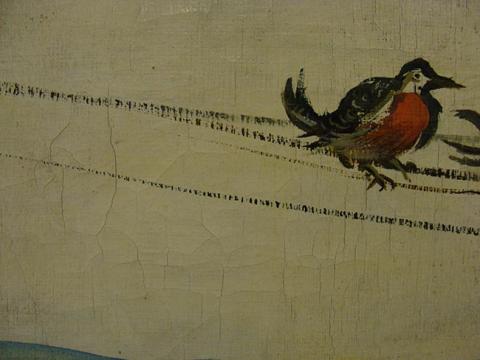 Obra de formato rectangular en orientación horizontal. Pintura figurativa, policromática, que representa una escena de exterior. Se observan, en primer plano, dos postes de luz donde reposan, serenamente, dos pequeñas aves de pecho colorado. Bajo ellas, en un monte, una tercera recoge un alimento del suelo. Al fondo de la pintura, cerros y montes de color ocre.