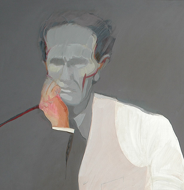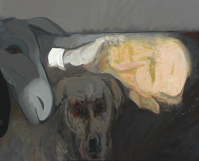 Obra de formato rectangular y orientación horizontal. Composición en base a dos figuras de equinos, uno gris y el otro negro. A su costado izquierdo se observa un torso de figura masculina con la mano derecha en el rostro, vistiendo un traje que tiene una mitad de color gris y la otra de blanco. Al costado derecho de los equinos, se observa un perro y arriba de este, el mismo personaje de traje vestido de gris, acostado, con una mano en el mentón. Fondo color gris.