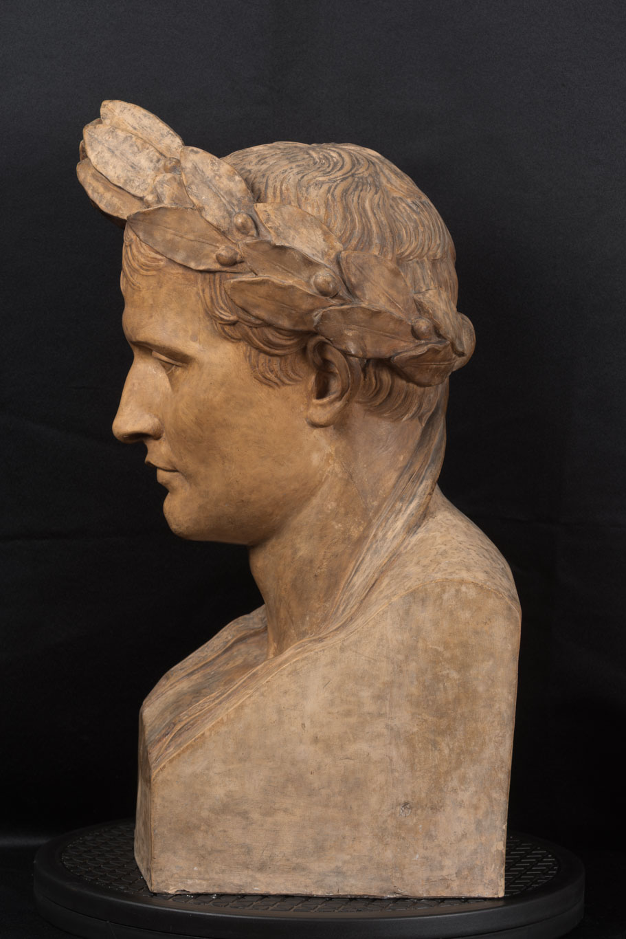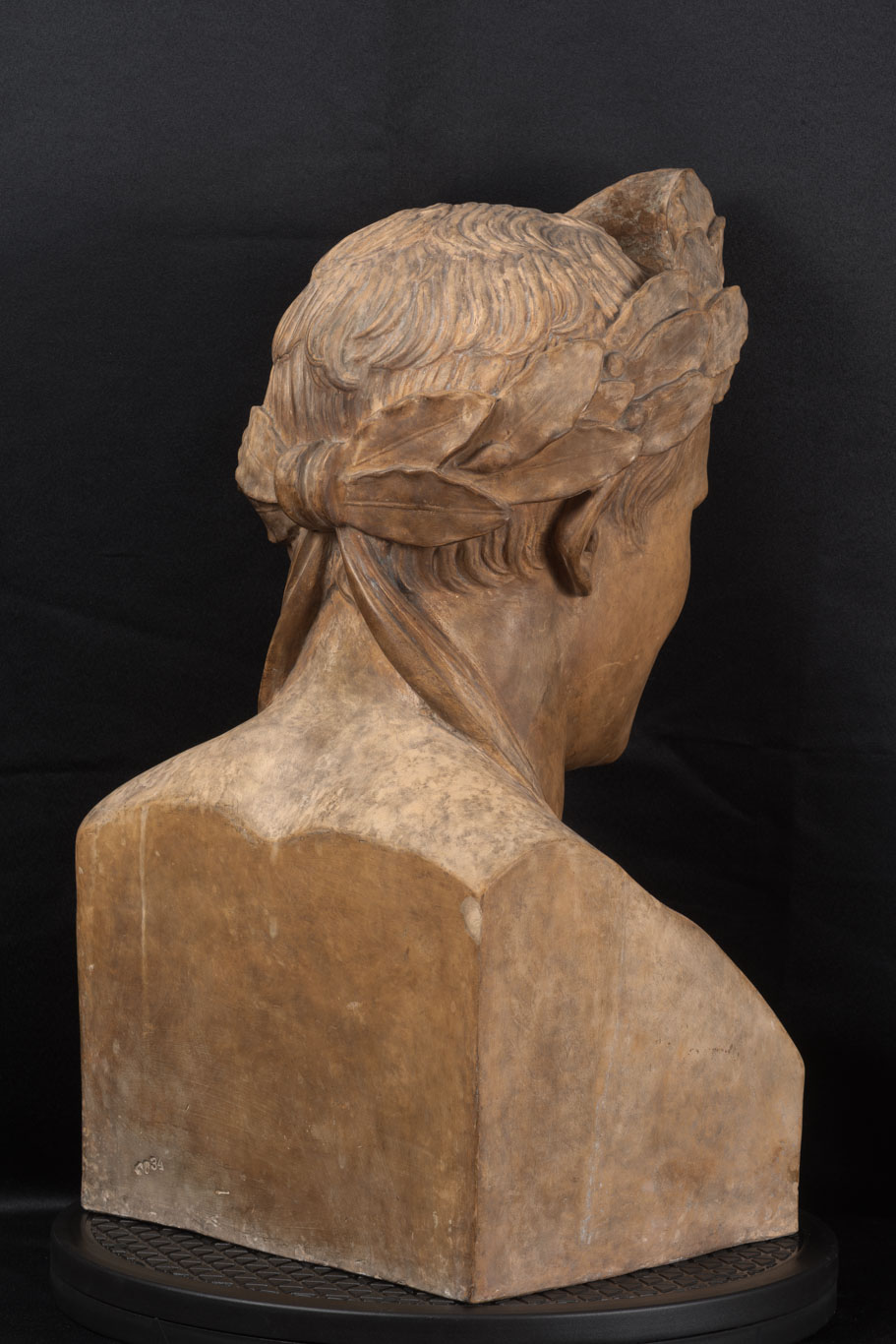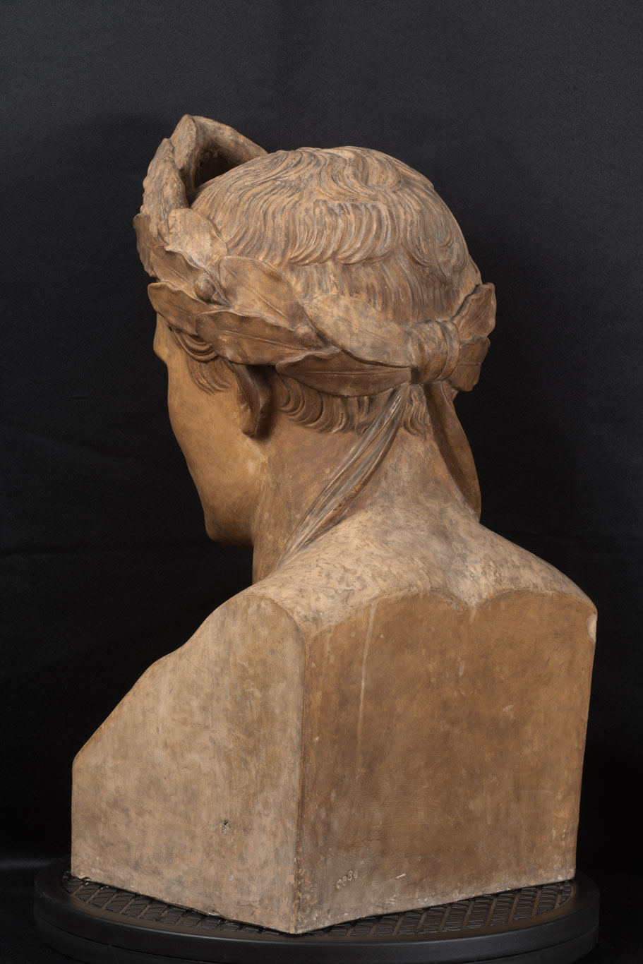Obra exenta. Composición en base a un busto masculino con el cabello corto y una corona formada por hojas que rodean su sien. Desde el cuello desciende una banda decorada con motivos florales.