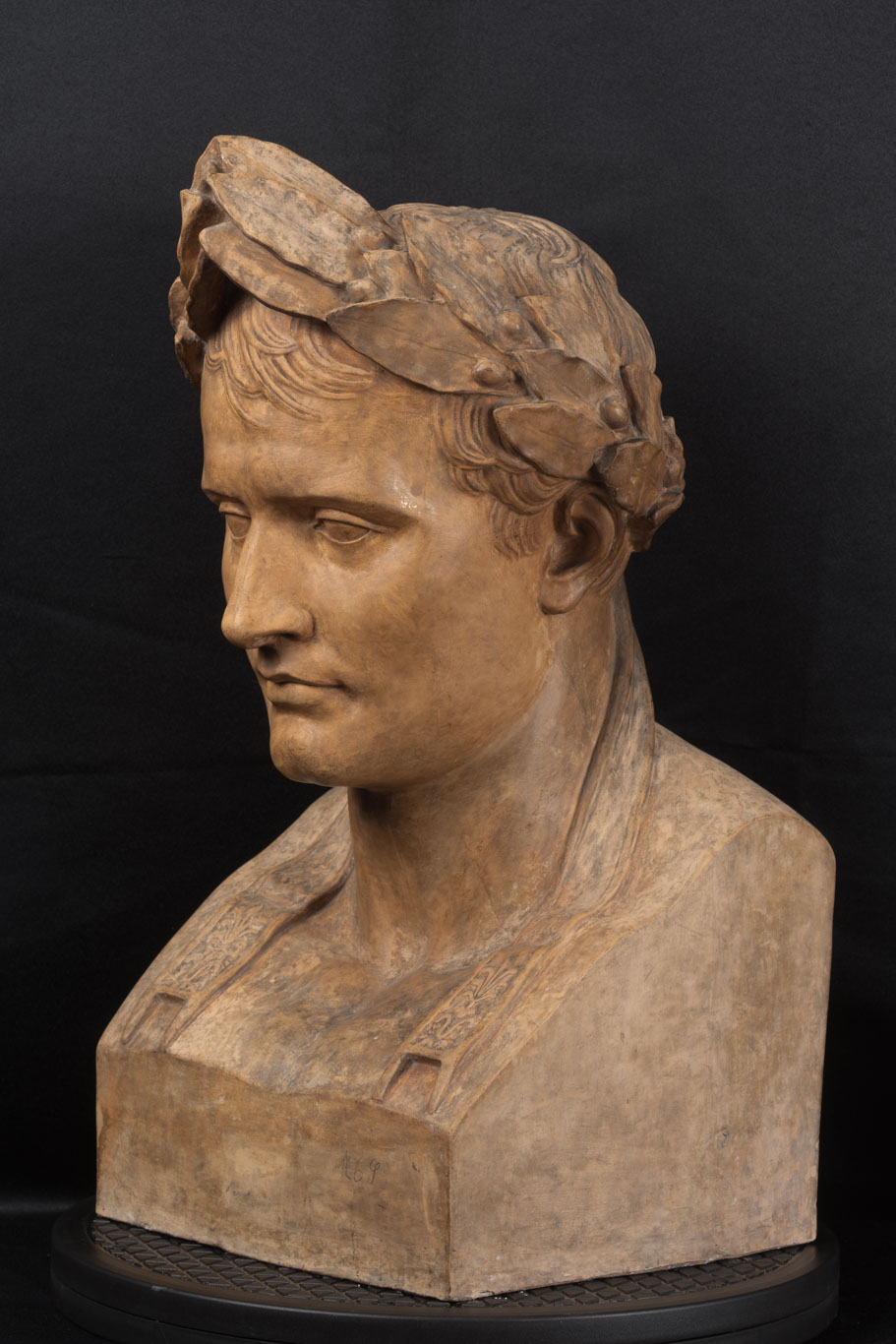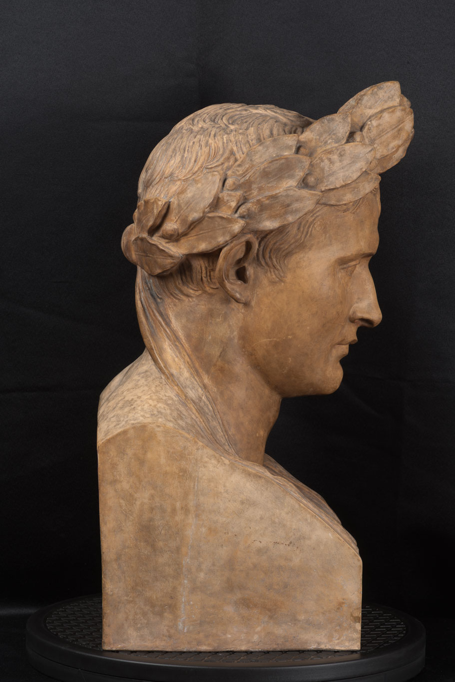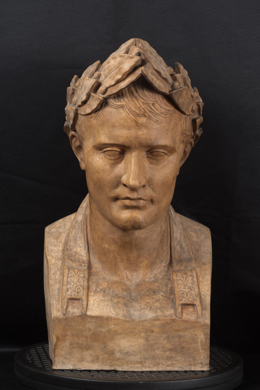 Obra exenta. Composición en base a un busto masculino con el cabello corto y una corona formada por hojas que rodean su sien. Desde el cuello desciende una banda decorada con motivos florales.