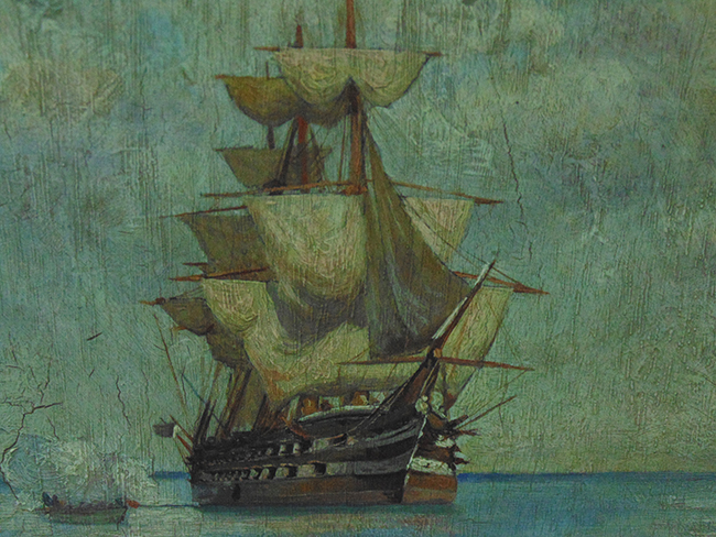 Obra de formato rectangular en orientación vertical. Pintura figurativa, policromática, que representa una escena marina. En plano central se observa una fragata en alta mar con un pequeño bote en su costado izquierdo. Más atrás, disminuida por la distancia, una tercera embarcación. Cielo nublado.