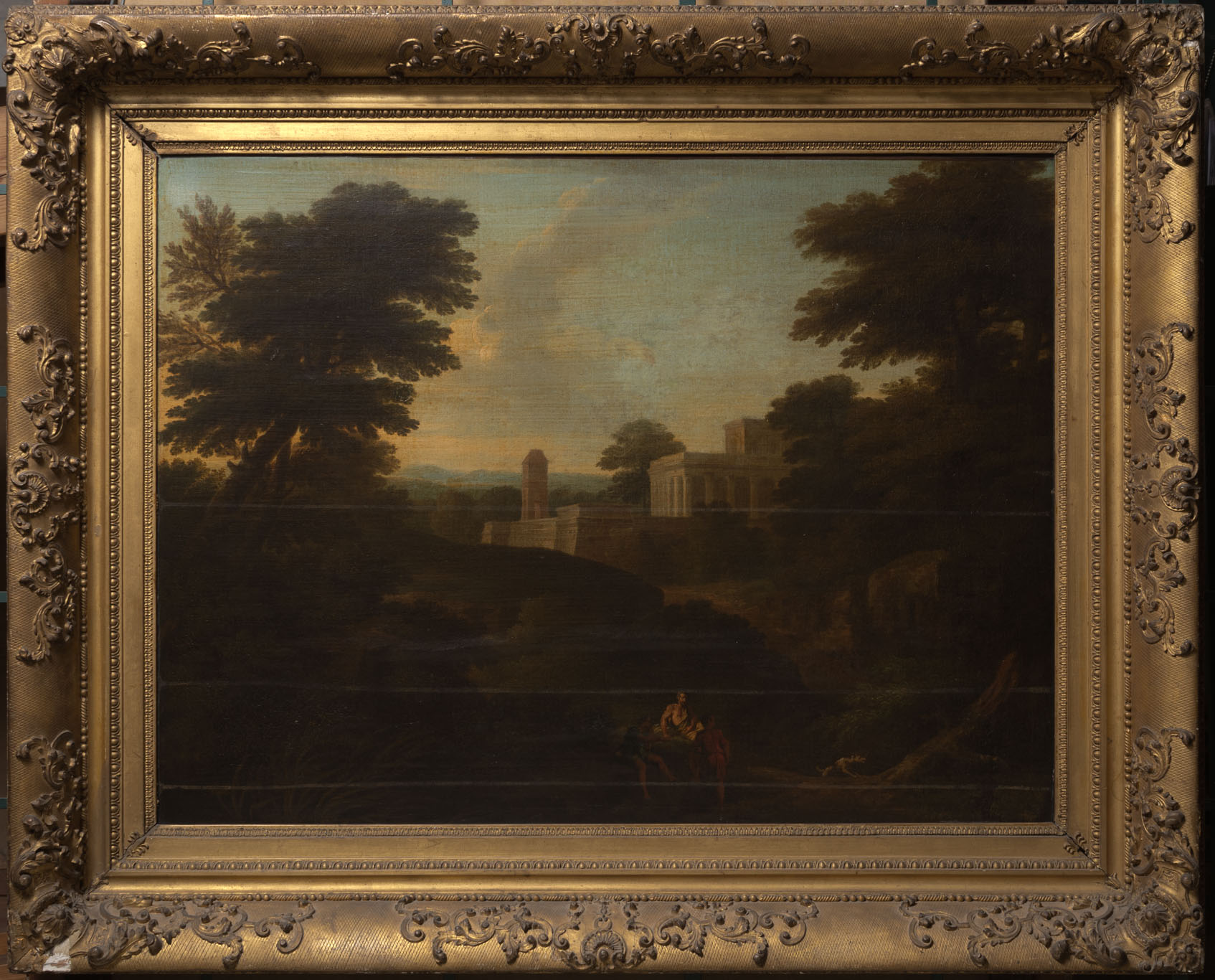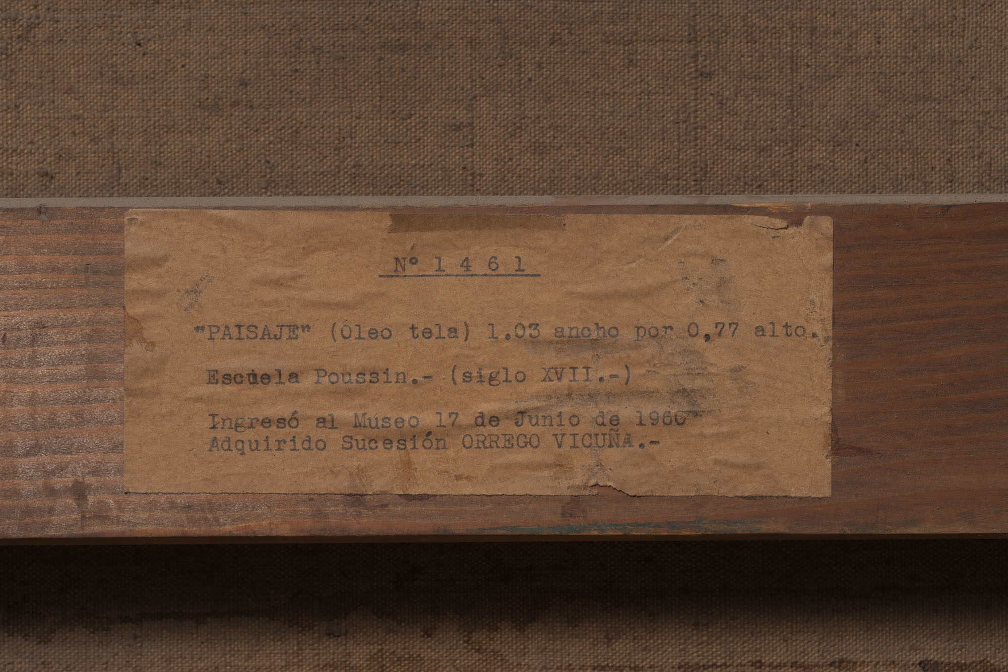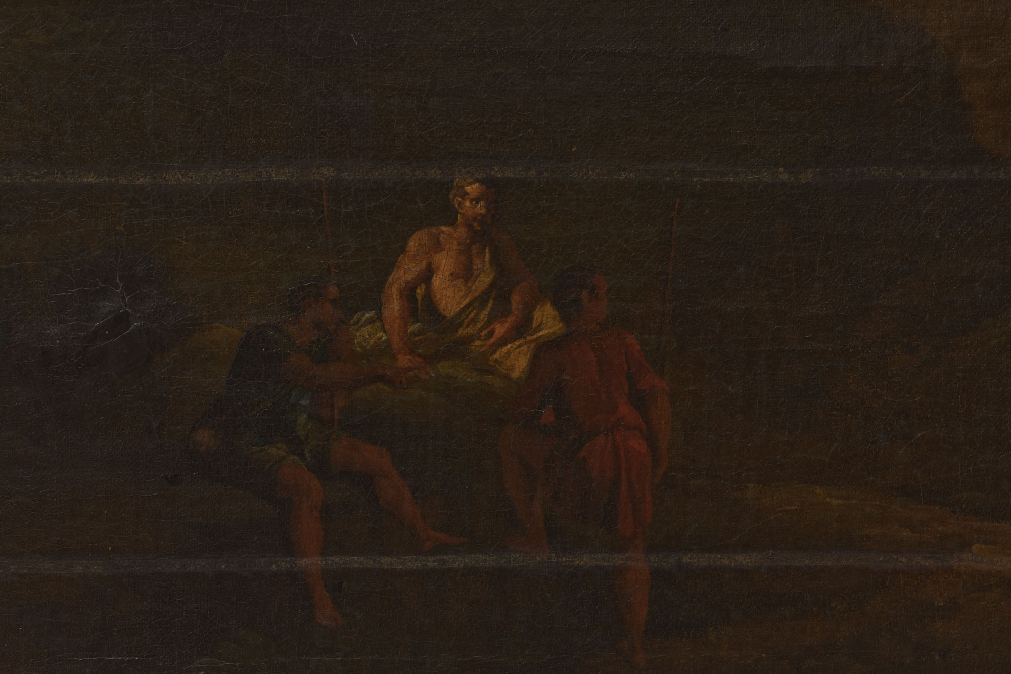 Obra bidimensional, de formato rectangular en orientación horizontal. Pintura figurativa, policromática, que representa un paisaje natural. En un entorno natural oscurecido, destacan en primer plano, tres figuras masculinos conversando mientras al fondo se observa una arquitectura clásica de color blanco.
