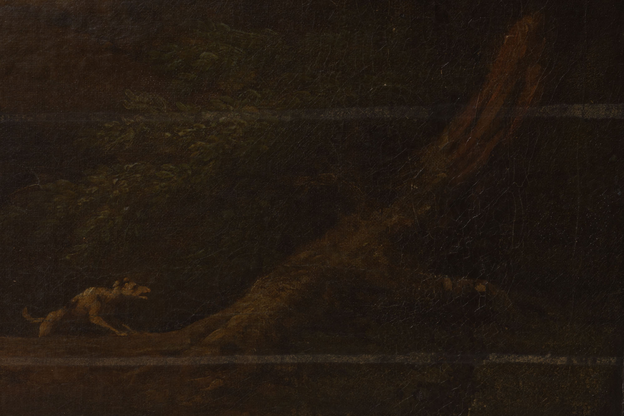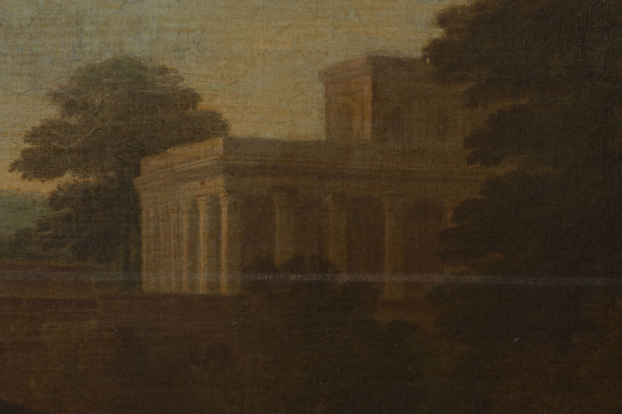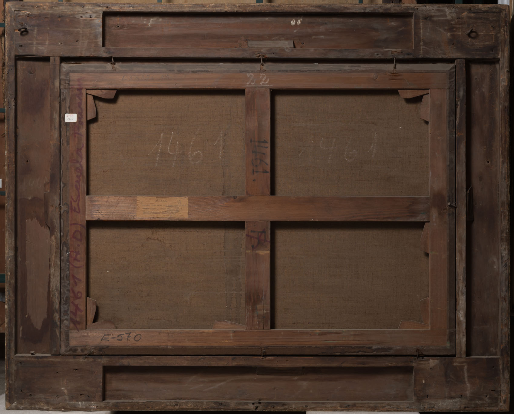 Obra bidimensional, de formato rectangular en orientación horizontal. Pintura figurativa, policromática, que representa un paisaje natural. En un entorno natural oscurecido, destacan en primer plano, tres figuras masculinos conversando mientras al fondo se observa una arquitectura clásica de color blanco.