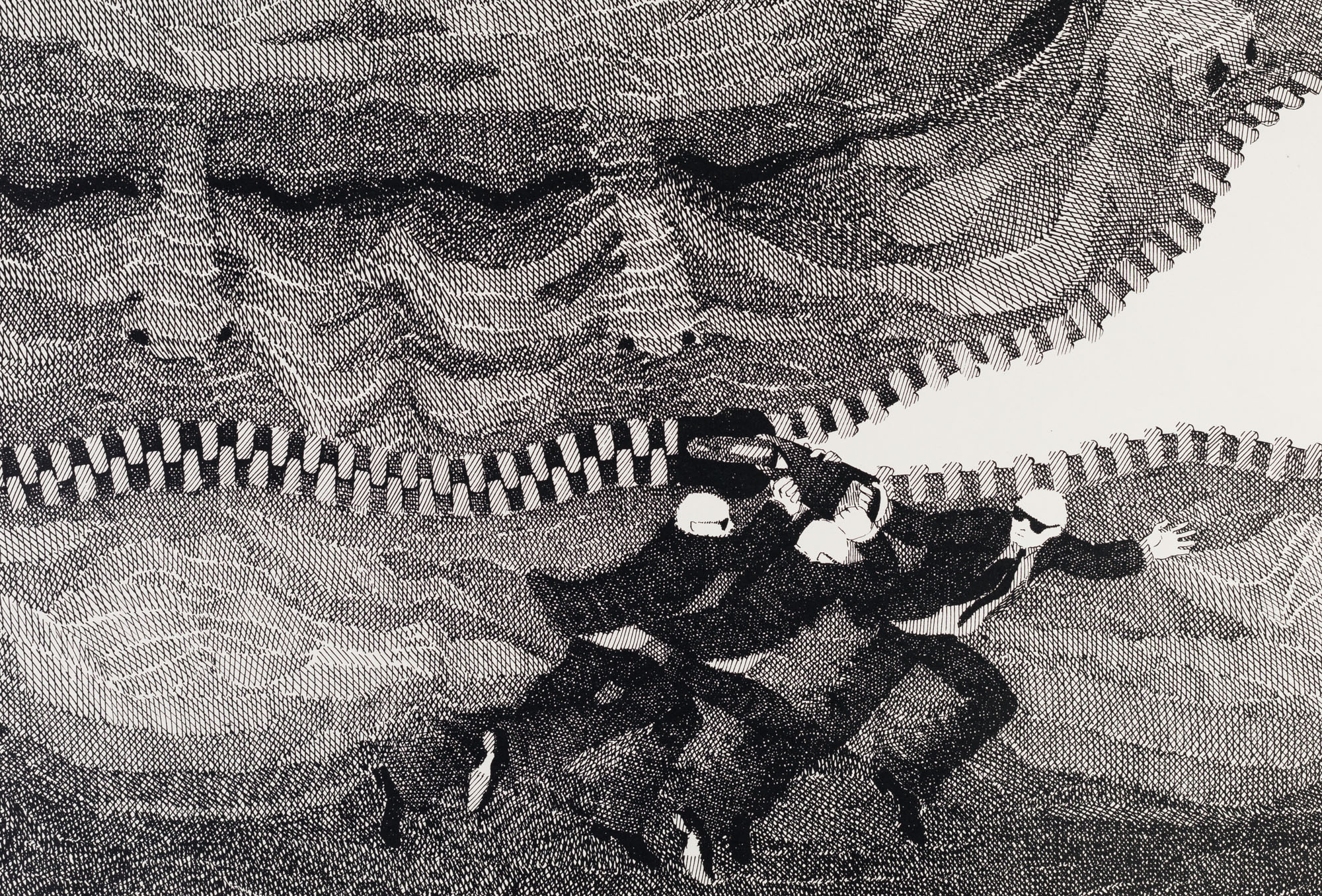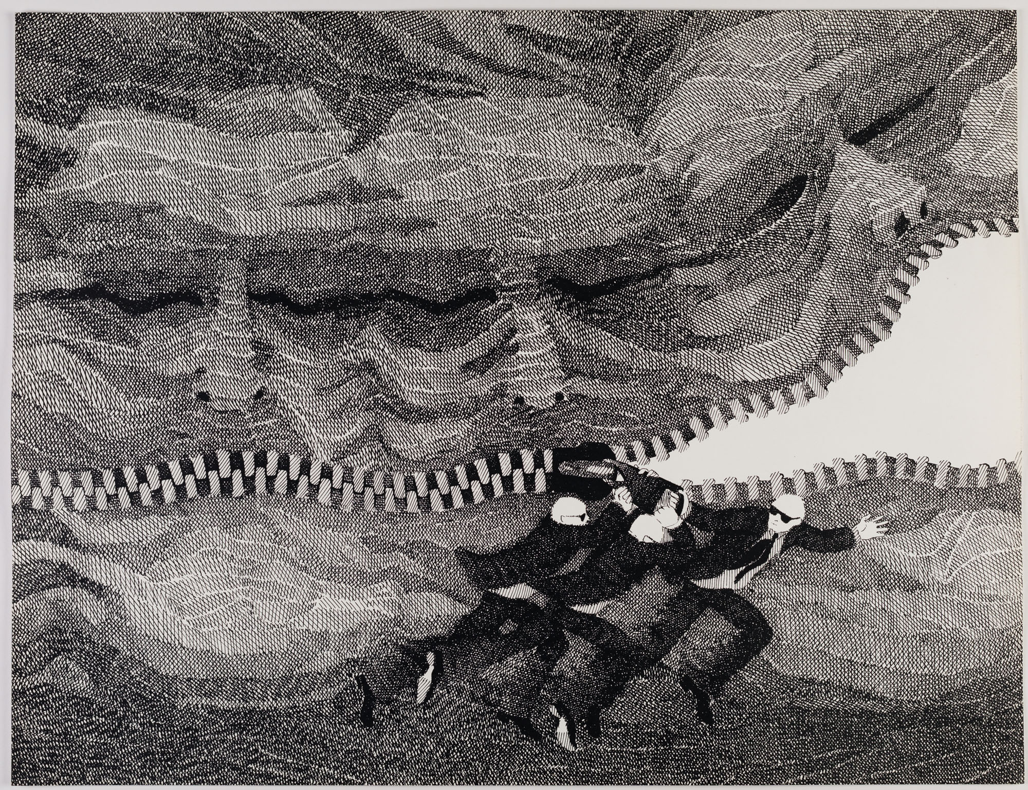 Obra de formato rectangular en orientación horizontal. Dibujo figurativo, monocromático, que representa tres retratos achurados, con los rostros apegados y unidos por una cremallera. Al frente, tres hombres de vestimenta formal y de pequeña estatura intentan cerrar esa cremallera.