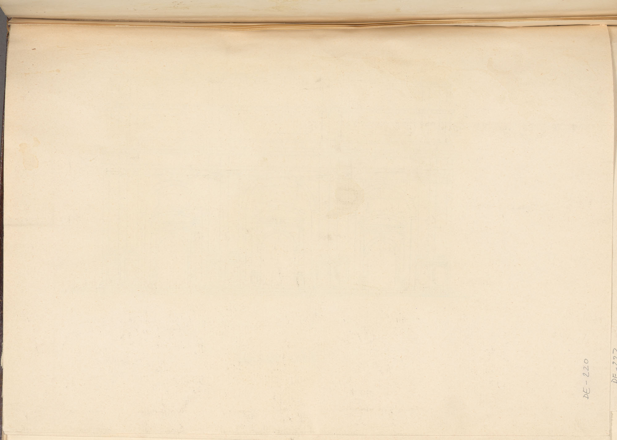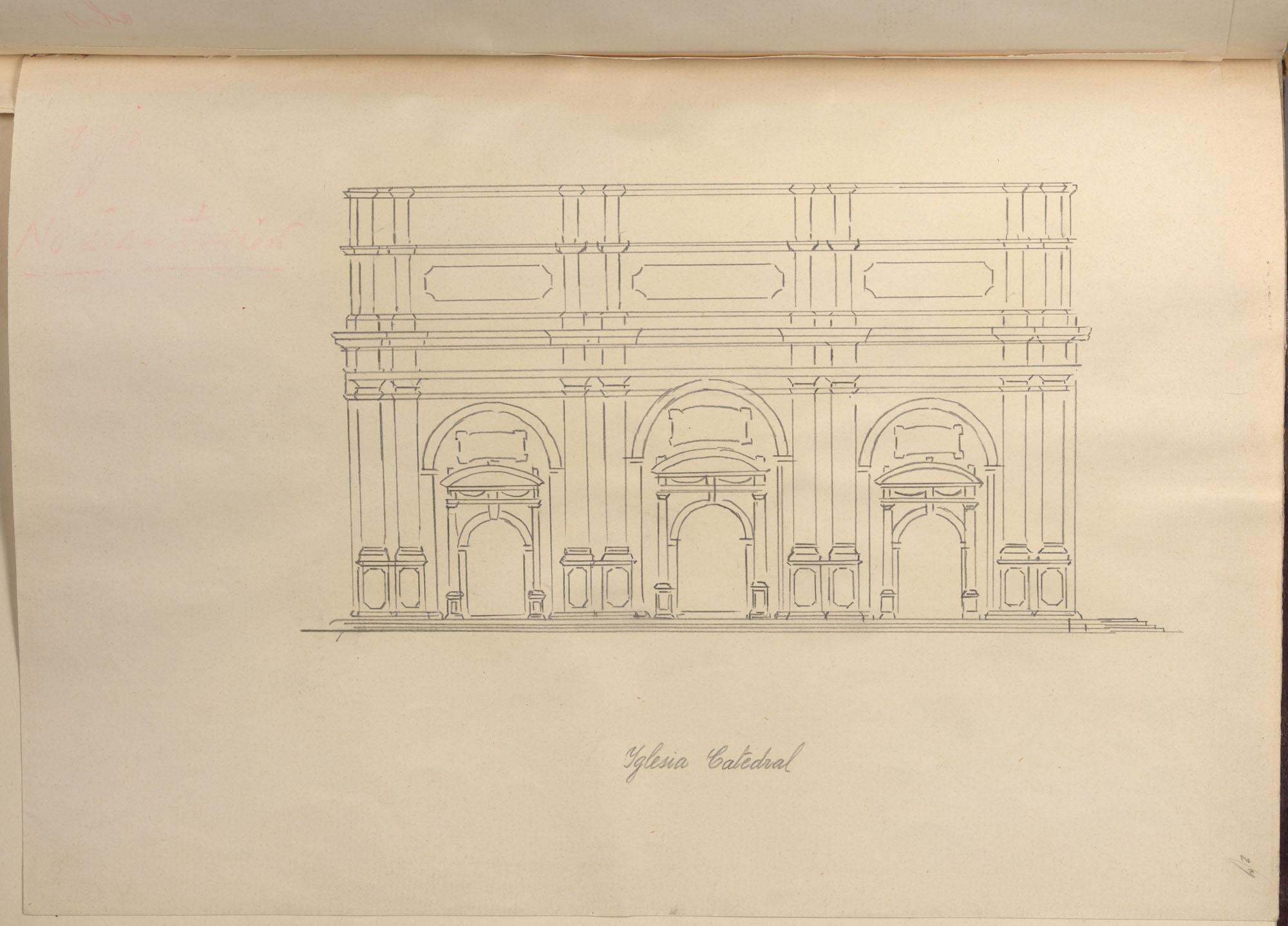 Obra de formato rectangular. Composición en base a boceto de fachada de edificio cuadrangular con columnas y tres puertas inscritas dentro de arcos de medio punto.