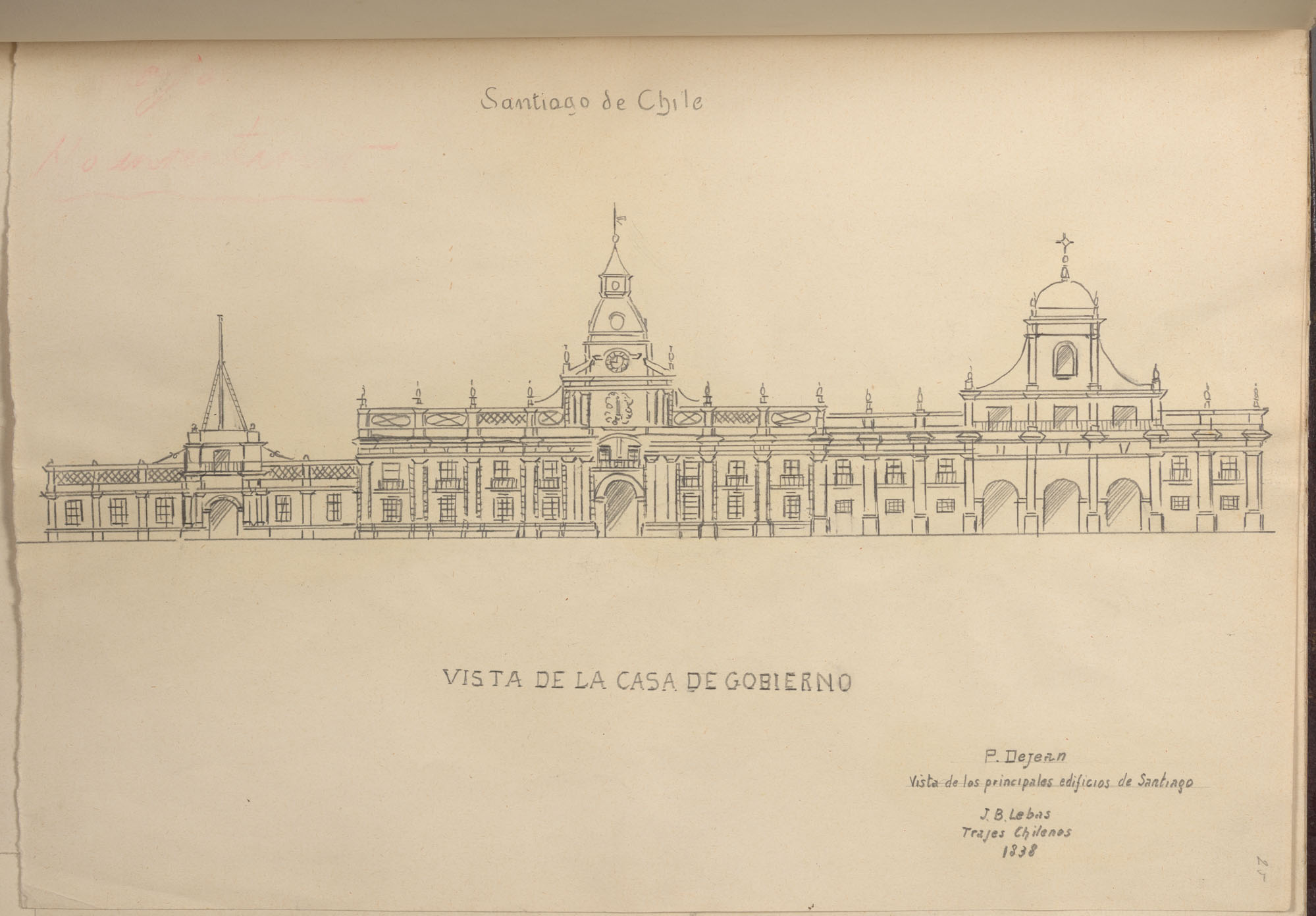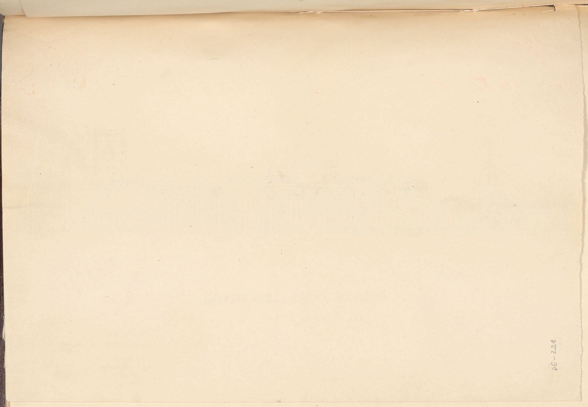 Obra de formato rectangular. Composición en base a fachadas de tres edificios contiguos de distintas alturas. Cada uno de ellos presenta columnas, arcos de medio punto, torreones y balaustradas distribuidas de manera simétrica.