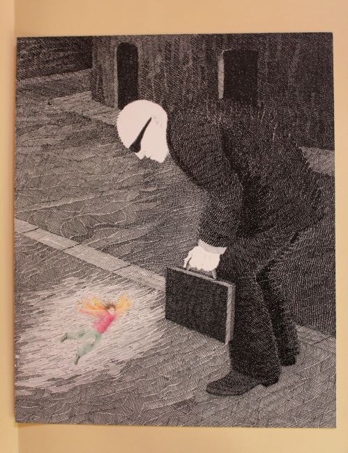 Obra de formato rectangular y disposición vertical en blanco y negro. Composición en blanco y negro, en base a una figura masculina calva en primer plano, viste traje y lentes oscuros, sostiene un maletín en su mano izquierda. Está inclinada hacia adelante y observa una figura masculina pequeña a color suspendida, tiene cinco brazos extendidos de color amarillo y viste pantalón verde con camiseta rosa. En un segundo plano se observa un paisaje urbano exterior.