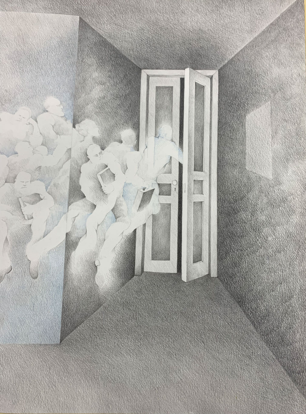 Obra en formato rectangular en posición horizontal, en tono blanco y negro con matices de azul, que representa una escena en interior. En un primer plano al centro, en la horizontal se observa un grupo de figuras humanas en distintas posiciones, de frente y de perfil. Se distinguen en estas siluetas, dos de ellas con lentes de sol y otras dos con grandes libros en su brazo izquierdo. En segundo plano hacia el lado derecho, hay una puerta de dos brazos, con uno de ellos cerrado y el otro entre abierto, por donde salen las siluetas.