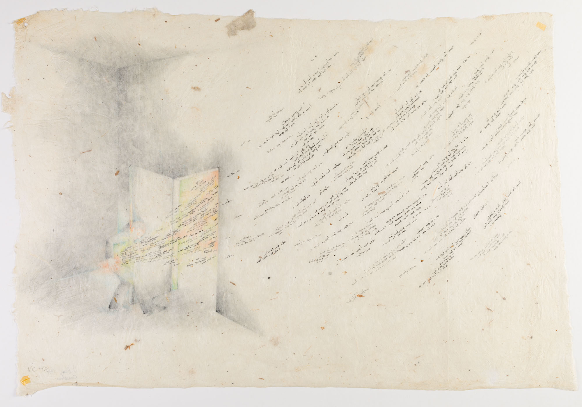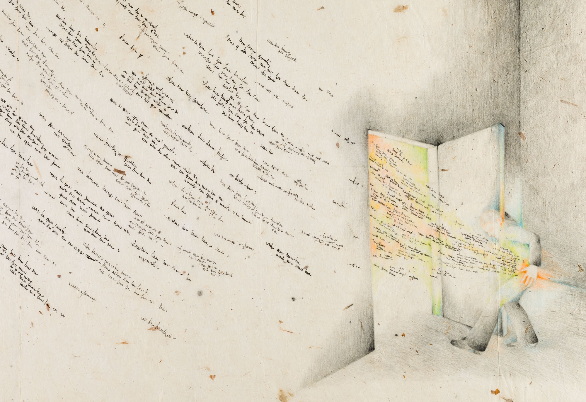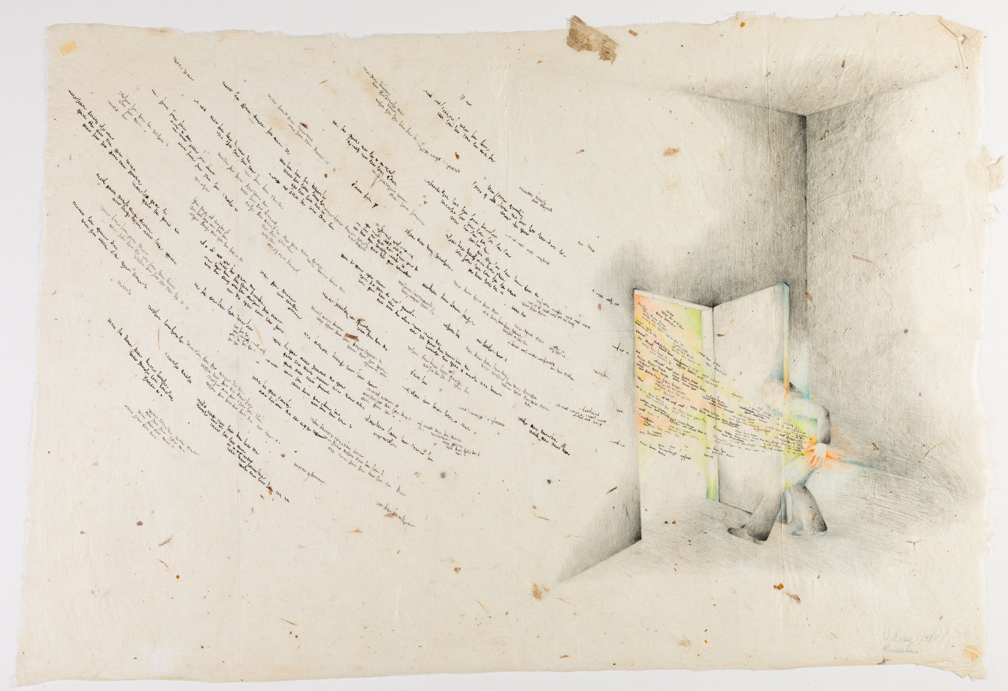 Obra en formato rectangular de posición horizontal y de bordes irregulares. A la derecha de la composición, una figura humana levemente inclinada hacia delante, abre una puerta cercana a una esquina de un paisaje interior en tonos grises. Al otro lado de la puerta y con un fondo verde y anaranjado, una textura de varios espirales negros entra hasta el abdomen de la figura humana. Hacia la izquierda de la composición, la textura se replica en forma curva, cubriendo la mayor parte de la superficie de la composición.