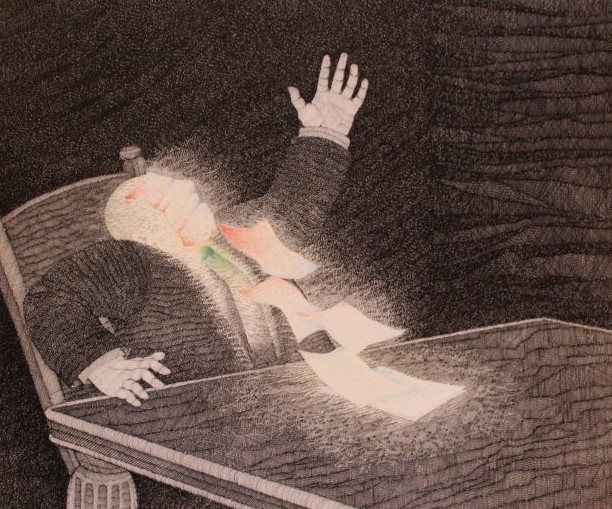 Obra en formato rectangular en posición horizontal. La figura central de la composición es una figura humana calva, vestida con un traje negro y con una corbata verde. Está sentada en una silla frente a una mesa, su brazo izquierdo está levantado y el derecho se apoya en el borde de la mesa. Su cabeza inclinada hacia atrás, tiene sobre la cara una hoja de papel en tonos azules y rojos, frente a ella y en dirección descendente, cuatro hojas de papel en los mismos colores, flotan hasta apoyarse sobre la mesa. El fondo es de una textura negra que se ve iluminada por la línea diagonal del eje que forman las hojas.