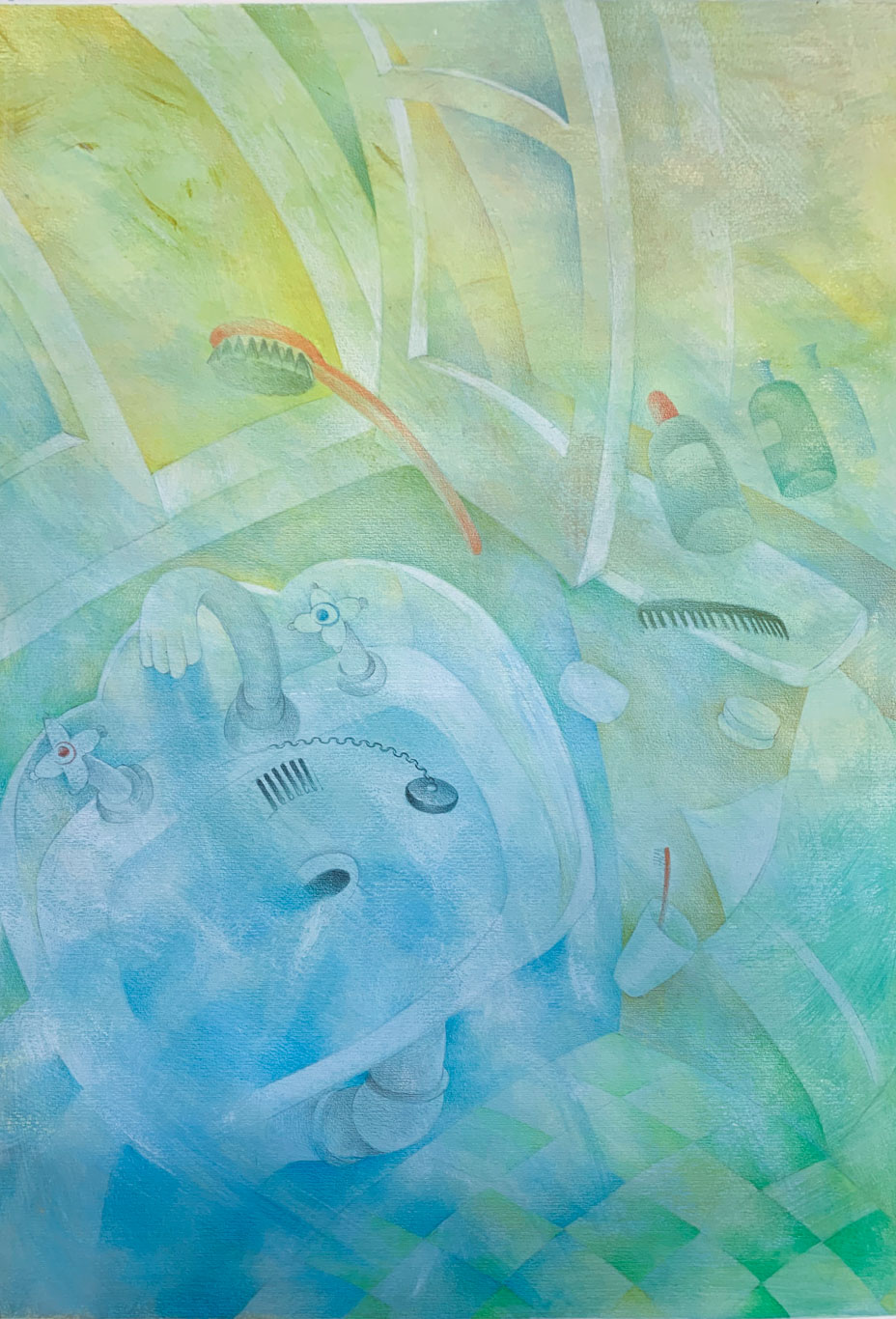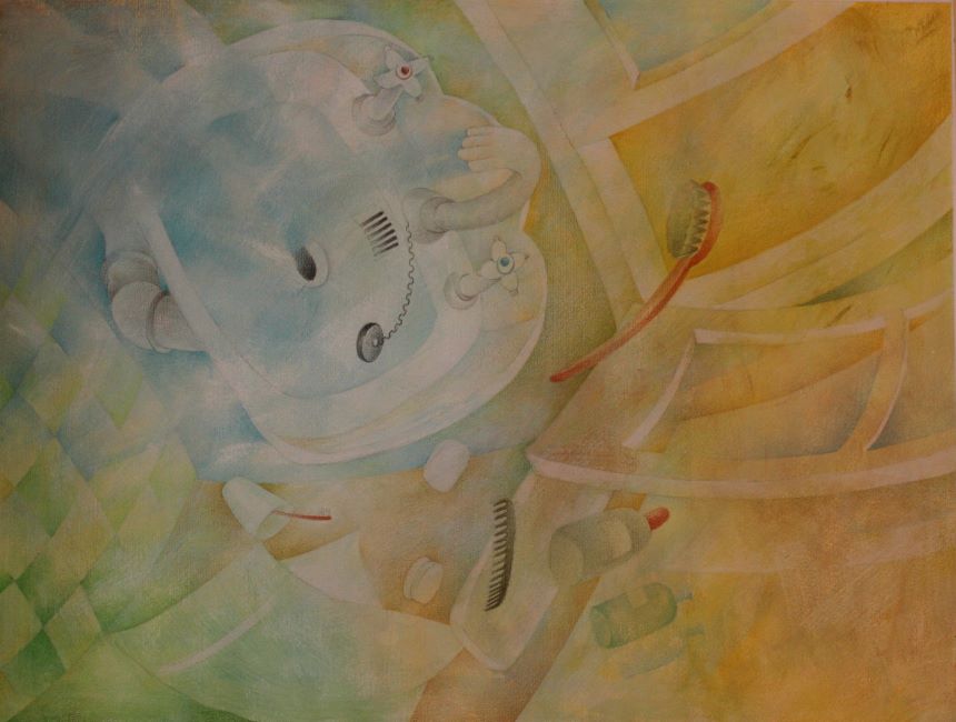 Obra en formato rectangular en posición vertical. La composición está cubierta de un fondo de matices amarillos, verdes y azules texturados. Se distingue un espacio interior de baño, hacia la izquierda y en primer plano un lavamanos sobre un piso cuadriculado, tiene la llave abierta que deja escurrir agua azul desde el grifo. Sobre la escena, una ventana abierta y hacia el costado derecho de la composición, distintos utensilios de aseo parecen flotar en el espacio: un cepillo, una botella, una peineta , un vaso y una toalla.