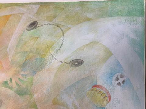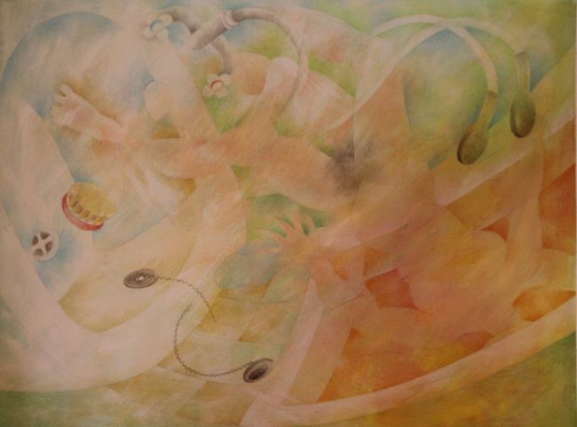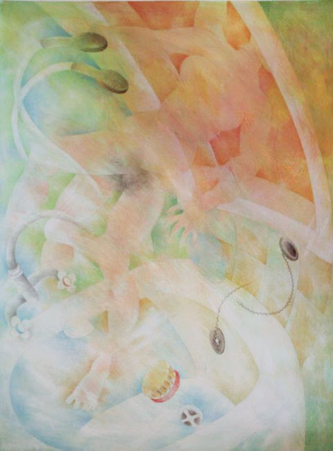 Obra en formato rectangular en posición vertical. La composición está sobre un fondo de veladuras de distintos colores principalmente matices de verde, anaranjado y azul. Sobre este fondo se distingue un paisaje interior de baño, en la mitad de abajo hay una tina de bordes blancos, se distinguen el desagüe, un tapón y un cepillo, además de la grifería y la ducha, sobre ella a la derecha una ventana abierta, y al centro sobre ambos elementos, la silueta de una figura humana con tres piernas y que se asoma desde la cintura por la ventana, sin dejar ver su cabeza.