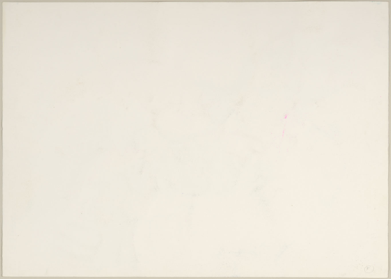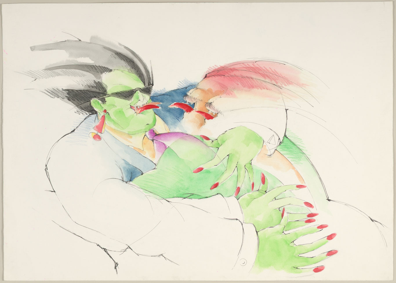 Obra en formato rectangular en posición horizontal. La composición es un boceto sobre un fondo blanco, con algunas partes de color. En un primer plano, dos figuras humanas de torso, una frente a la otra se abrazan y hacen contacto con sus lenguas largas y puntiagudas. Una figura masculina de piel verde y abundante cabello negro hacia atrás, viste un traje azul, camisa amarilla y corbata rosa, usa lentes oscuros y un largo arete rojo en su oreja derecha. Tiene tres brazos que muestran sus largas uñas rojas, con los que abraza a una segunda figura que está levemente inclinada sobre él, con un vestido verde de espalda descubierta y una cabellera roja hacia atrás.