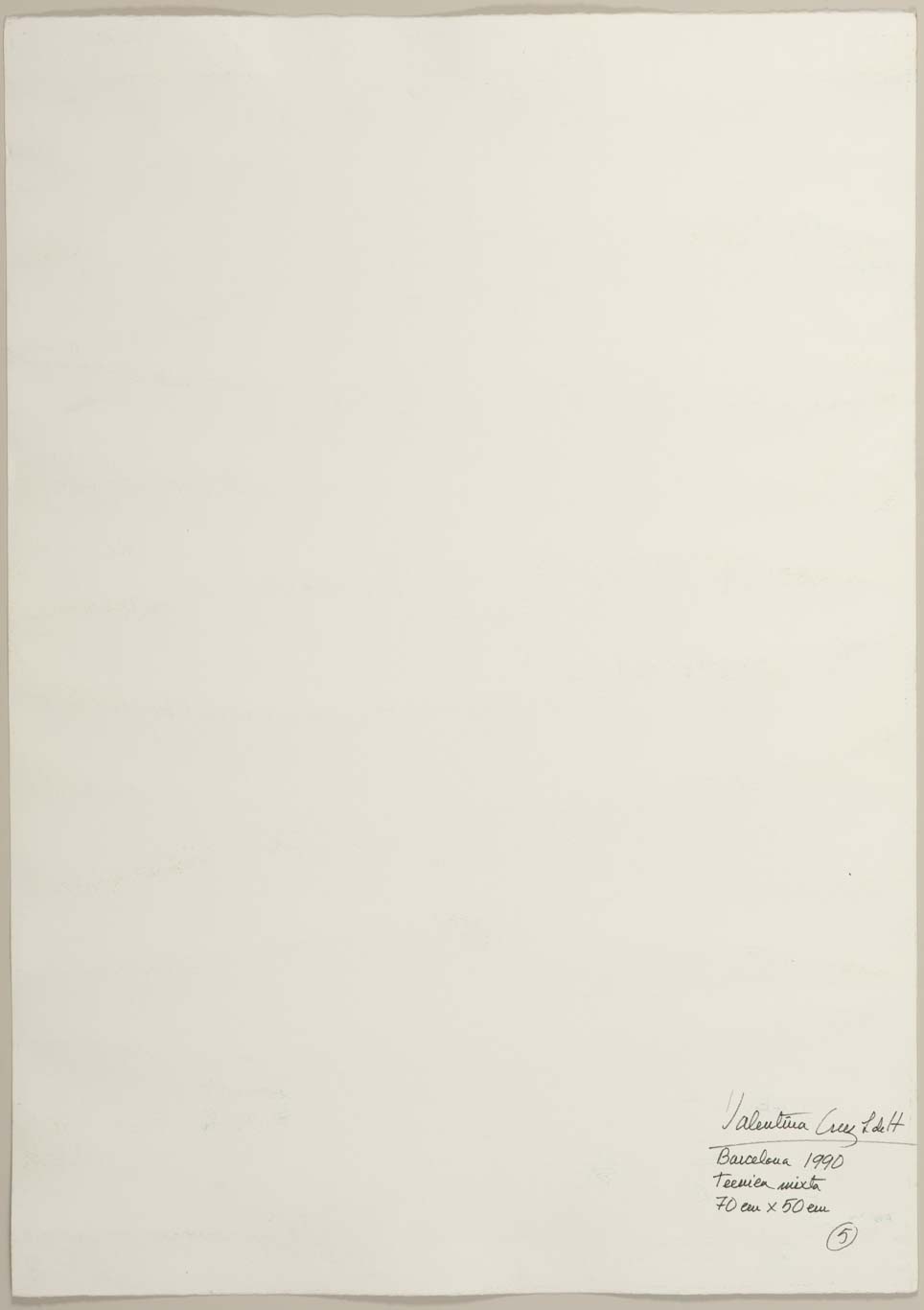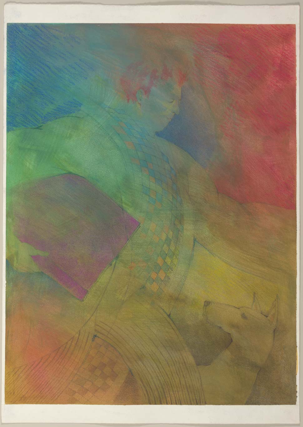 Obra en formato rectangular en posición vertical. El fondo está cubierto de colores que se combinan en degradación, desde los azules, verdes, amarillos y anaranjados hasta el rojo y el marrón. Sobre este fondo se distingue una figura humana que ocupa la mayor parte de la composición, tiene el cabello rojo y lleva en su mano derecha, bajo el brazo, un volumen rosado de forma rectangular, tiene el pecho cubierto de una textura cuadriculada que se proyecta hacia abajo por una de sus piernas. Dirige su mirada y su caminar hacia el borde derecho del dibujo, donde un perro lo observa desde la esquina inferior derecha.