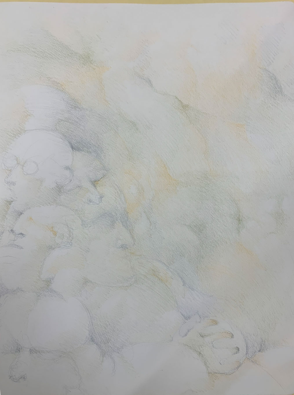 Obra en formato rectangular en posición vertical. La composición se basa en un dibujo de siluetas grises y amarillas sobre un fondo blanco. Al lado izquierdo se distinguen varios rostros agrupados unos sobre otros que observan en distintas direcciones, hacia abajo del dibujo en la esquina inferior derecha se ven un par de manos enlazadas y apoyadas sobre un regazo.