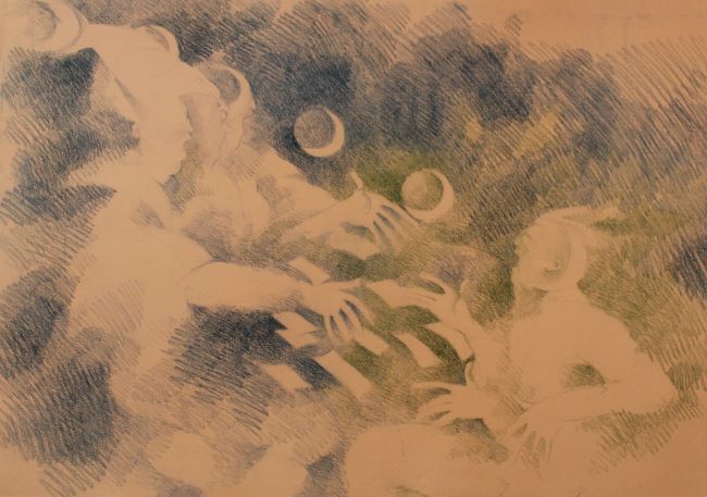 Obra en formato rectangular en posición horizontal. Sobre un fondo azul con matices de verde se presentan las siluetas en blanco de dos figuras que se confrontan y se observan entre si, en la esquina superior izquierda hay tres perfiles que comparten un mismo torso y dos brazos con sus manos abiertas hacia el centro, frente a ella en diagonal y hacia la esquina inferior derecha, un segundo torso que lo observa de perfil y que tiene tres brazos. En un segundo plano, en el centro de ambas figuras hay un conjunto de figuras blancas rectangulares y sobre ellas, al menos tres circunferencias en forma de lunas.