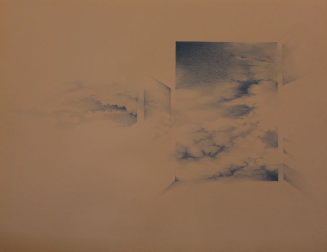 Obra en formato rectangular en posición horizontal en blanco y azul. La composición organiza al centro y en la horizontal, tres planos rectangulares que forman un volumen, el que está de frente al espectador está completamente cubierto de una textura de cielo y nubes, que se difumina hacia los costados.