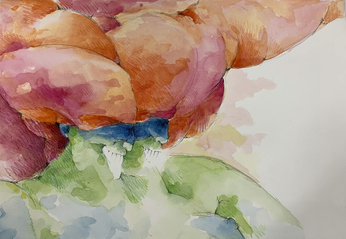 Obra en formato rectangular en posición vertical. Sobre un fondo blanco hay dos torsos de perfil de color verde y de rostro alargado que usan antifaz azul. Sobre sus cabezas y a modo de grandes tocados, hay un gran volumen en tonos rosa y anaranjado que ocupa la parte superior de la composición.