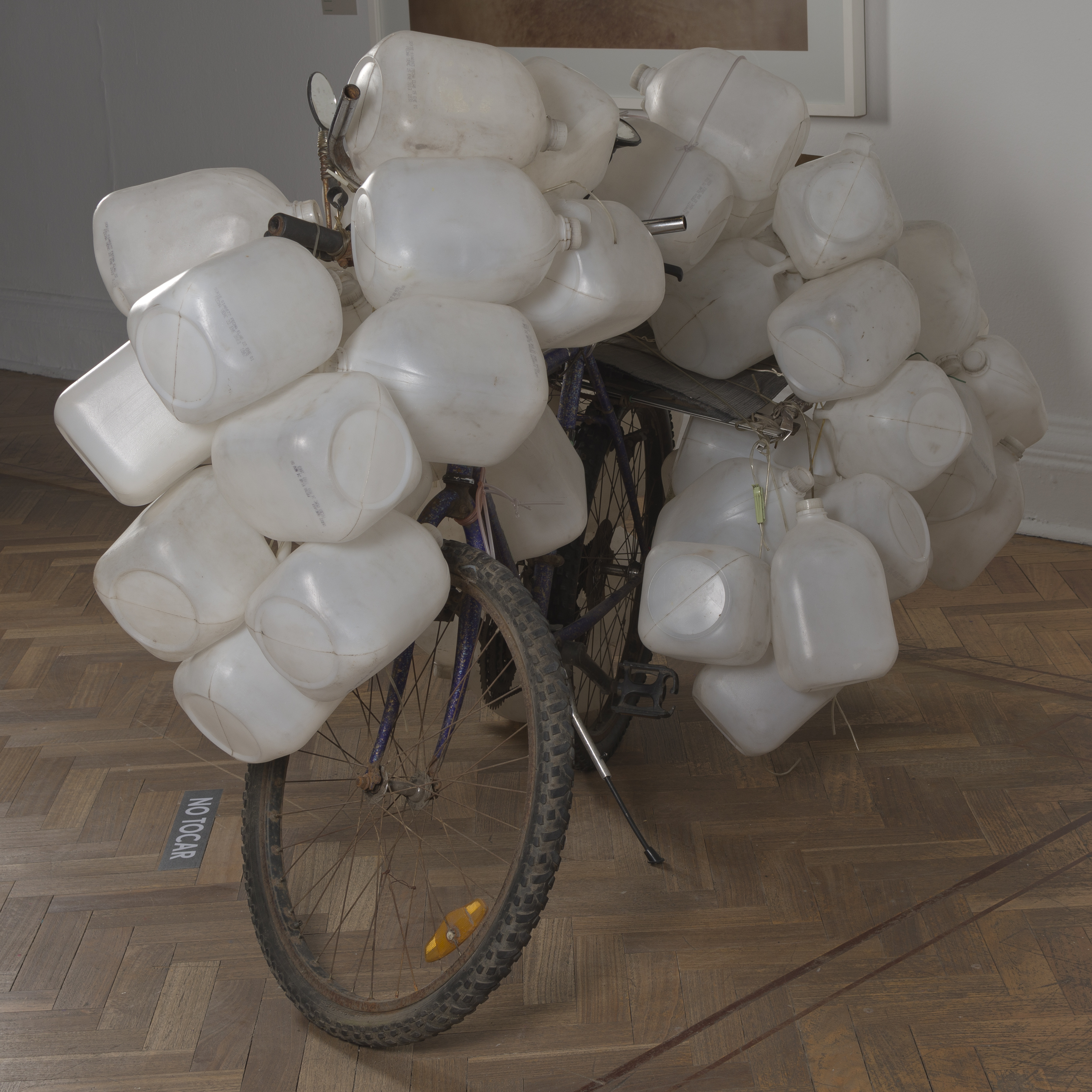 Obra exenta compuesta por una bicicleta cromada negra, de cuya estructura cuelgan bidones blancos agrupados en el manillar, en el cuadro y en el asiento.