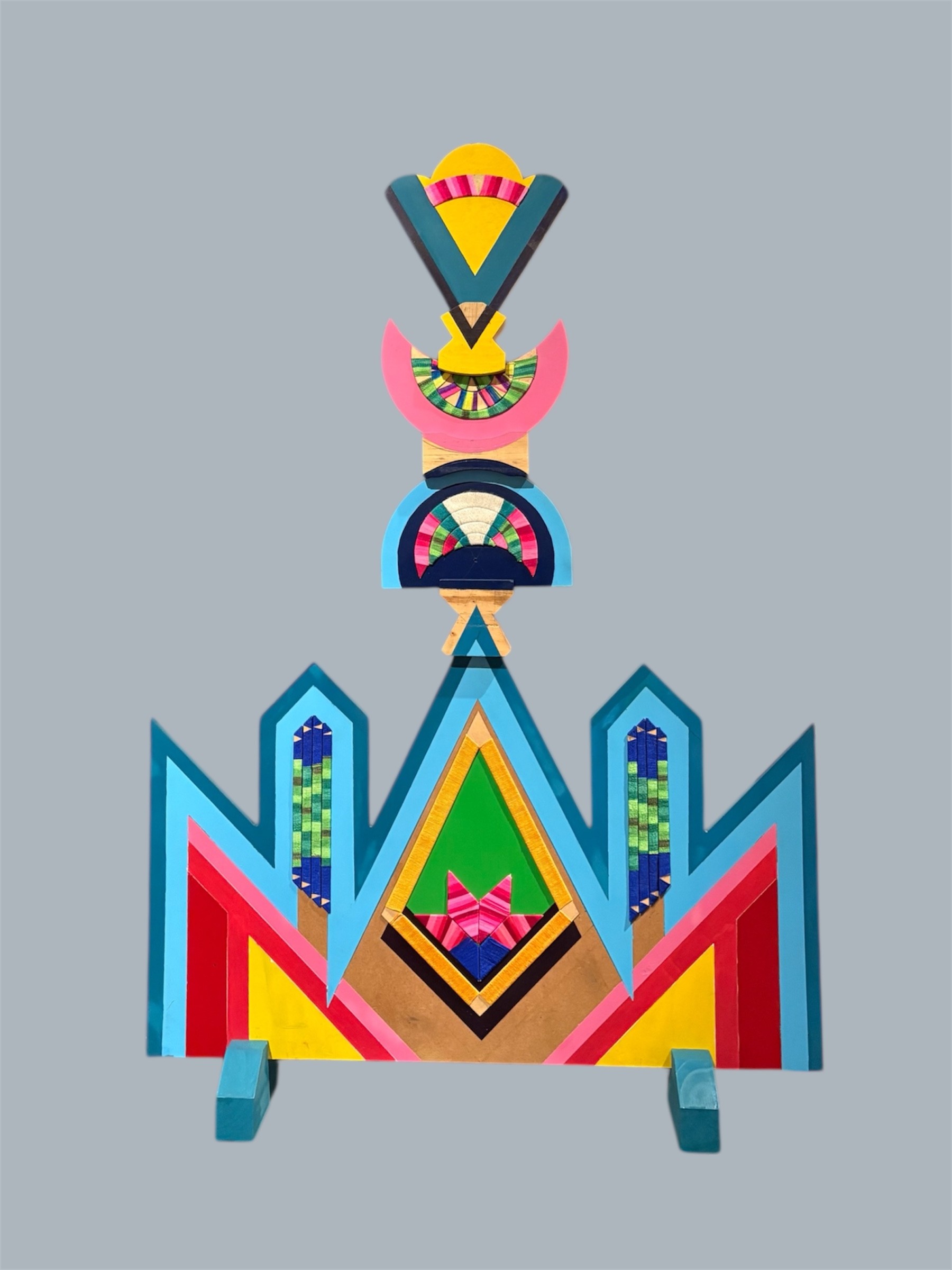 Obra exenta. Composición en base a piezas de madera con diversas formas geométricas coloreadas, cubiertas con hilos entorchados y ensambladas longitudinalmente. El conjunto descansa sobre dos pivotes cuadrangulares.