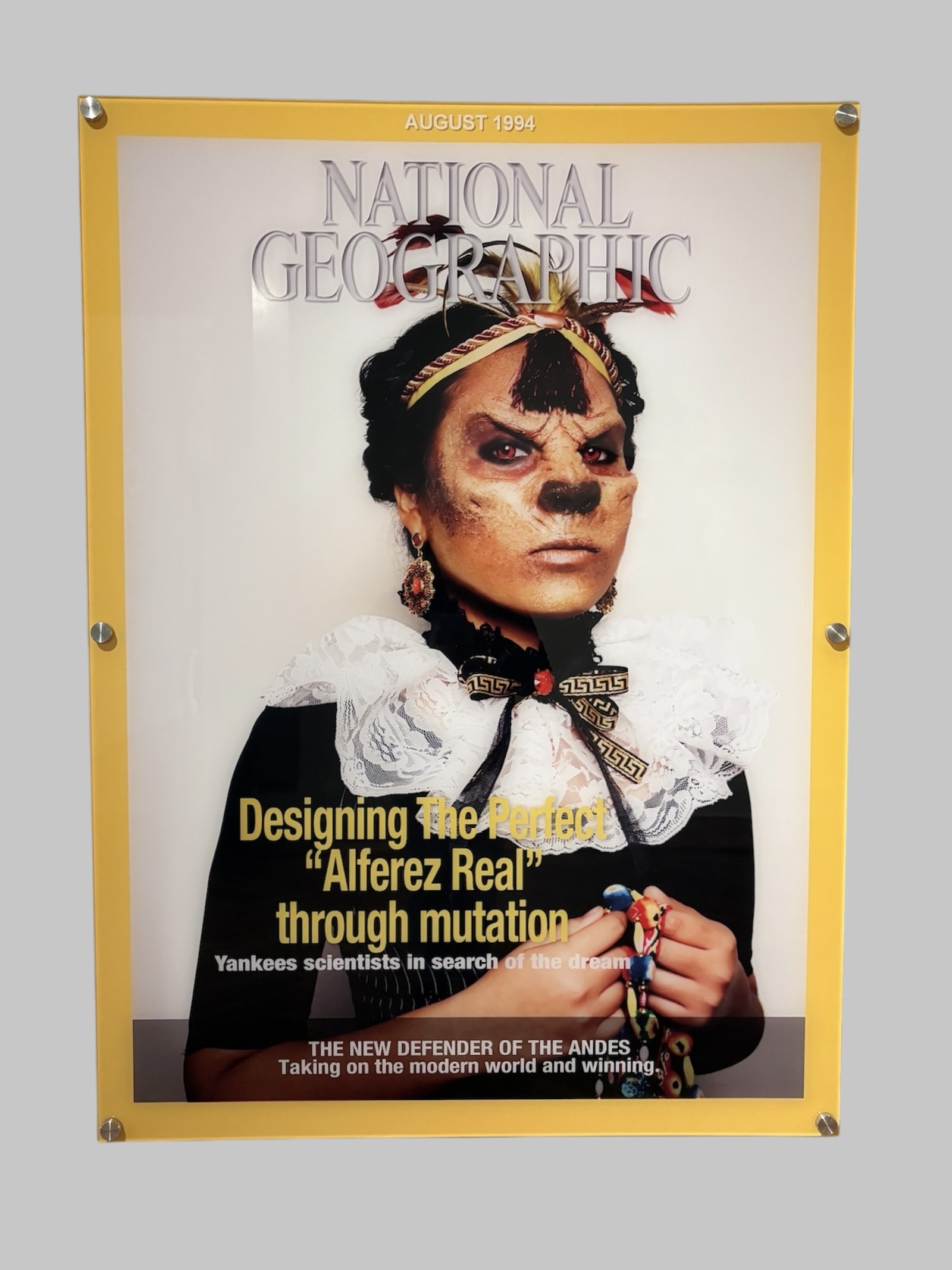 Fotografía de formato rectangular y orientación vertical. Composición en base a retrato femenino. La mujer viste traje negro con cuello de encaje. Lleva el pelo trenzado sobre la cabeza y un tocado, mientras que su rostro está cubierto por prótesis que le dan un aspecto zoomorfo. Sus manos están sosteniendo un objeto textil a la altura del pecho. En la parte superior e inferior hay textos en inglés.