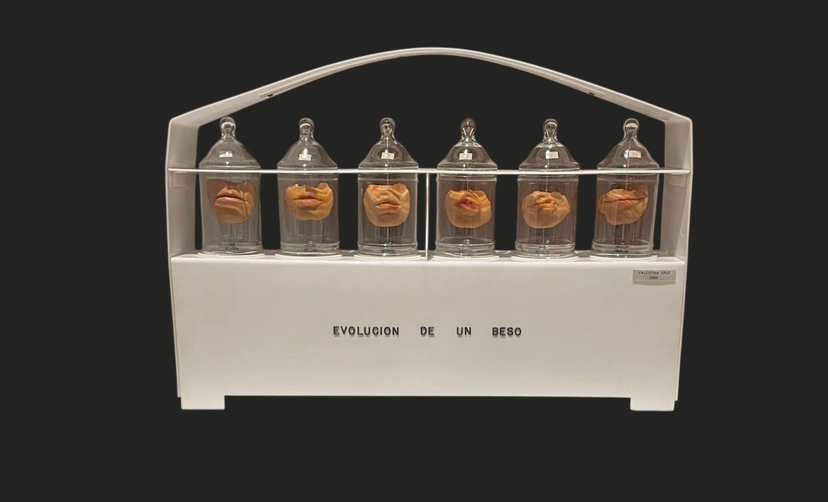 Obra exenta compuesta por una estructura blanca que contiene seis frascos de vidrio traslúcido con tapa. Cada uno de estos tiene en su interior la reproducción de una boca de silicona de color rosa anaranjado realizando distintas muecas. En la parte inferior del soporte hay un texto.