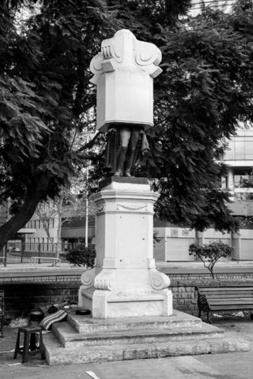Fotografía de formato rectangular y orientación vertical. Composición en base a paisaje urbano. En primer plano, hay un espejo de agua y un plinto con una escultura que aparece casi completamente cubierta por un volumen cúbico blanco. Al fondo la fachada de un edificio cubierto por ventanas cuadrangulares y otro con balaustrada.