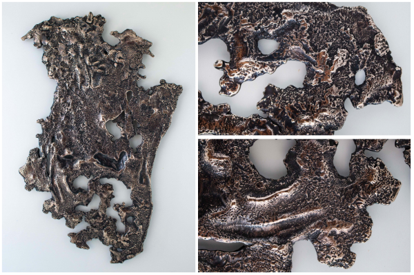 Obra exenta de formato irregular. Placa de bronce pulido, texturada y de espesor variable con orificios de distintos diámetros distribuidos en toda la pieza.