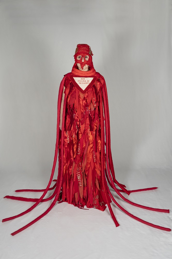 Fotografía de formato rectangular y orientación vertical. Composición en base a retrato femenino de cuerpo completo. La mujer se encuentra cubierta por un traje rojo, compuesto por listones de tela y una máscara. En el pecho lleva inscrito un mensaje sobre un triángulo invertido blanco. El fondo es gris.