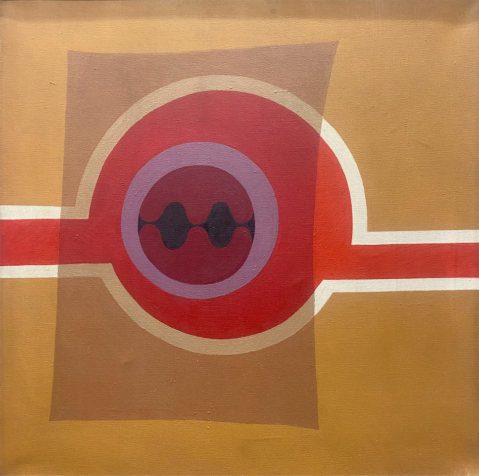 Obra de formato rectangular y composición horizontal. Composición abstracta en base a la superposición de formas geométricas y planos de color. Al centro, hay una figura circular roja de borde rosa y formas en negras en su interior. Esta a su vez se encuentra inscrita en un círculo mayor, también rojo y de borde blanco, unida a los extremos con otras formas cuadrangulares. Sobre esto, hay un cuadrado ocre. El fono es anaranjado.
