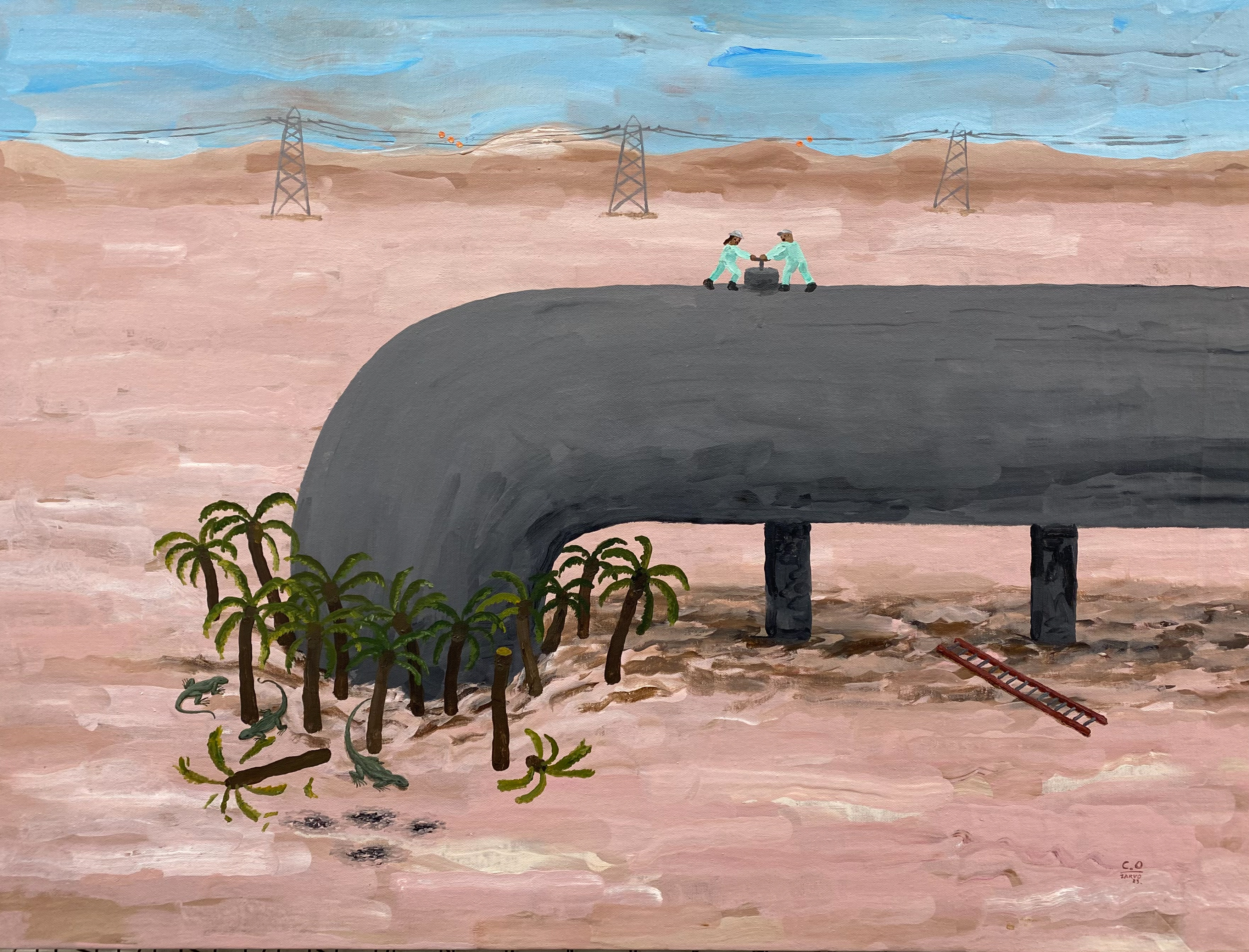 Obra de formato rectangular y orientación horizontal. Composición en base a escena exterior. Al centro hay una gran cañería curvada de color gris –con dos pequeños personajes arriba– aplastando a un conjunto de palmeras. El fondo es un paisaje desértico rosa con una línea de torres de alta tensión.