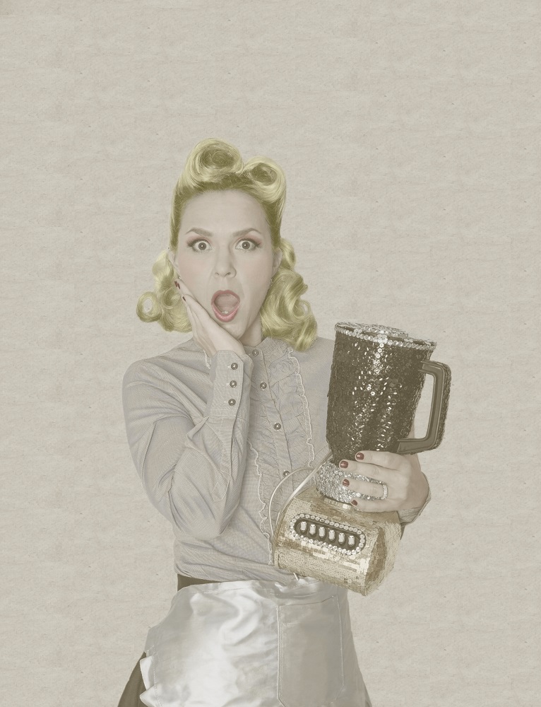 Obra rectangular y orientación vertical. Fotografía a color en base a retrato femenino frontal y tres cuartos. La mujer, con cara de sorpresa, apoya su mano derecha extendida sobre su mejilla; mientras que con la izquierda sostiene una juguera brillante que apoya sobre su cuerpo. Su pelo está peinado con grandes bucles, usa blusa a cuadrillé, un mandil de raso y un anillo de compromiso. El fondo es color crema.
