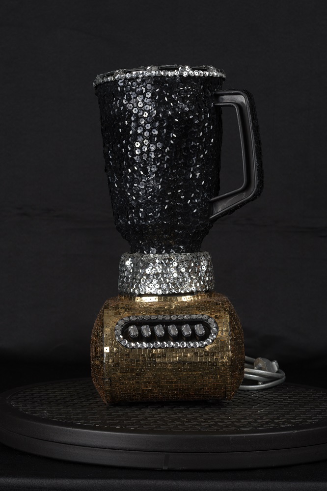 Obra exenta.  Mezcladora con lentejuelas en todo su exterior. La parte superior de la tapa y el jarro llevan lentejuelas negras. El borde la tapa, anillo y mando llevan lentejuelas plateadas. La base tiene lentejuelas doradas y botones cubiertos con estrás. El cable es plateado.