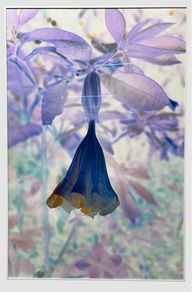 Obra de formato rectangular y orientación vertical. Fotografía a color en base a una representación floral. Al centro, una flor de forma acampanada de color azul, violeta y anaranjado que cae de una rama con hojas violáceas. Al fondo, abundante follaje celeste, rosa y lavanda.
