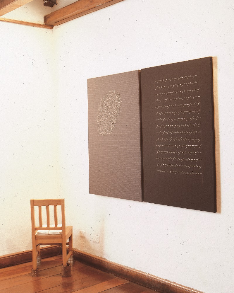 Instalación. Obra en base a cuatro bastidores de tela negra con figuras formadas con alfileres dorados prendidos sobre esta. Frente a estos se disponen dos sillas de madera con ocho latas de aluminio sobre el asiento.