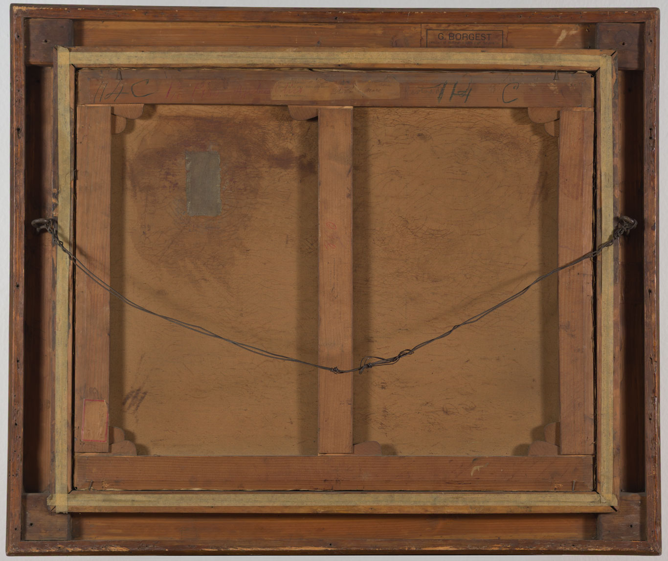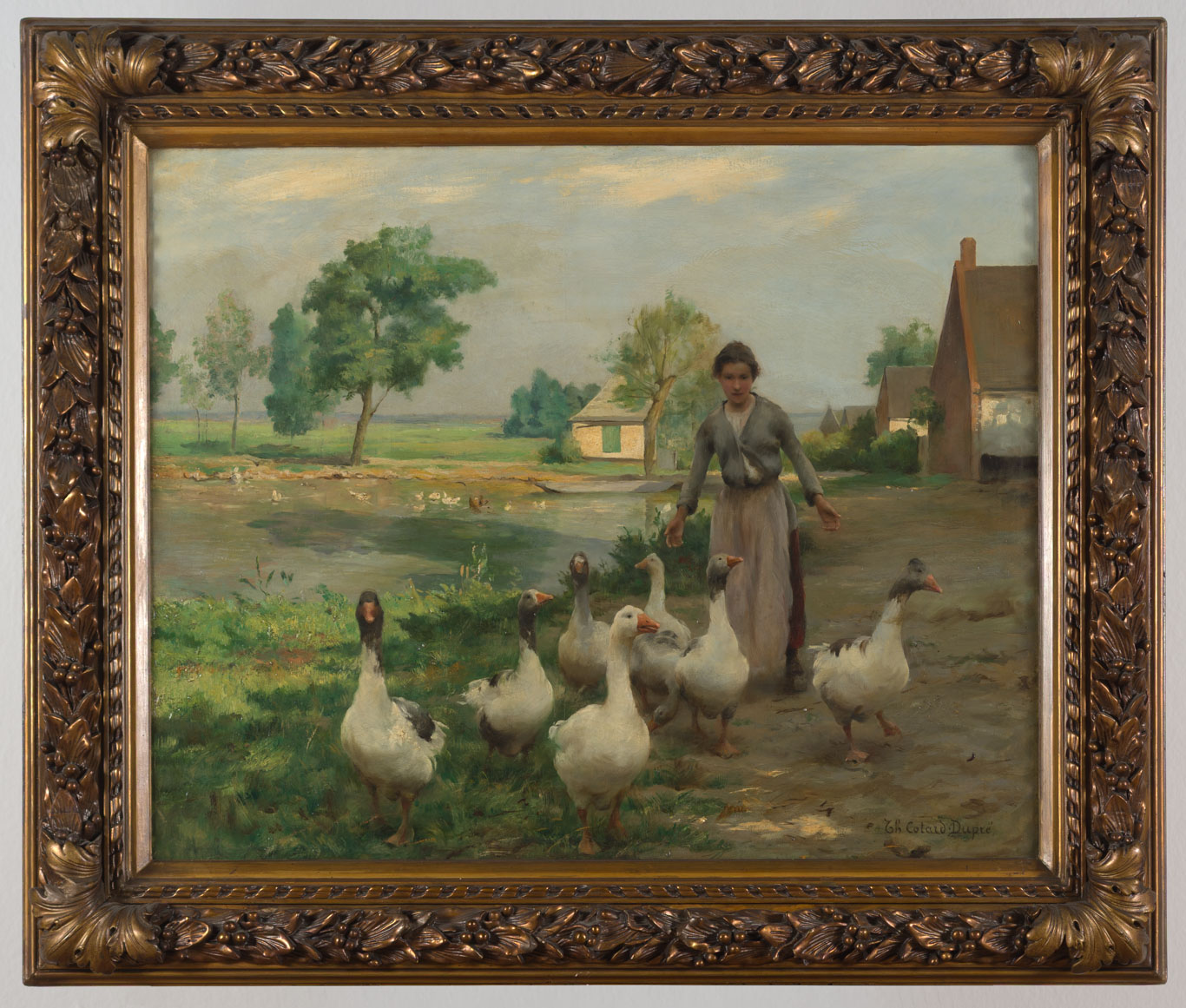 Obra de formato rectangular y orientación horizontal. Composición en base a escena exterior. En primer plano, al centro, hay una bandada de gansos acompañados por una figura femenina vestida con blusa gris, falda y delantal blanco. Al centro, en la sección izquierda hay una laguna y, en la derecha, construcciones. Al fondo, paisaje campestre y cielo celeste.