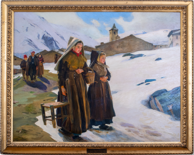 Obra de formato rectangular y orientación horizontal. Composición en base a escena exterior. En primer plano, hay dos figuras femeninas vestidas con velos, corpiños, faldas y suecos de color café. Una de ellas porta una silla de paja y una cesta. En segundo plano, tres figuras se asoman por un camino. Al fondo, una iglesia de piedra, nieve y montañas.
