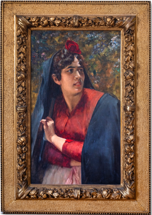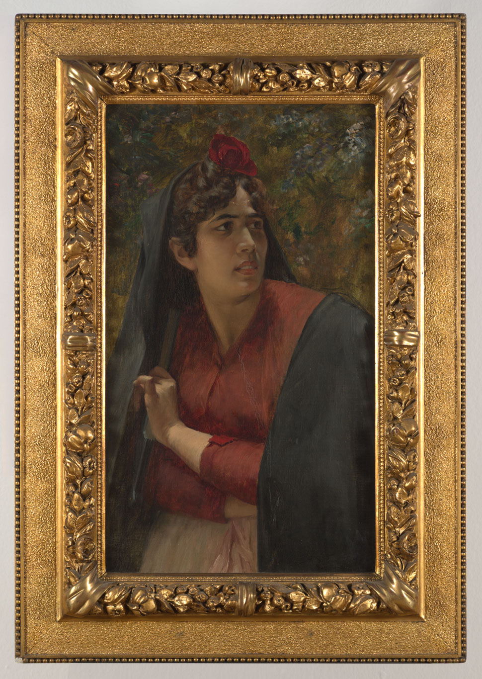 Obra de formato rectangular y orientación vertical. Composición en base a retrato de figura femenina vista de tres cuartos. La mujer viste blusa roja, falda rosa y capa azul oscuro. Sobre su cabello recogido lleva una flor roja. Su mirada se dirige hacia la derecha y tiene los brazos cruzados. Al fondo vegetación frondosa.