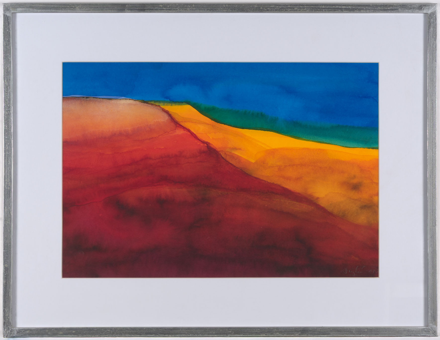 Obra de formato rectangular y orientación horizontal. Composición en base en base a planos de color superpuestos en degradé. En la sección izquierda hay una gran franja roja, seguida de una amarilla y una más pequeña verde. La parte superior es azul.