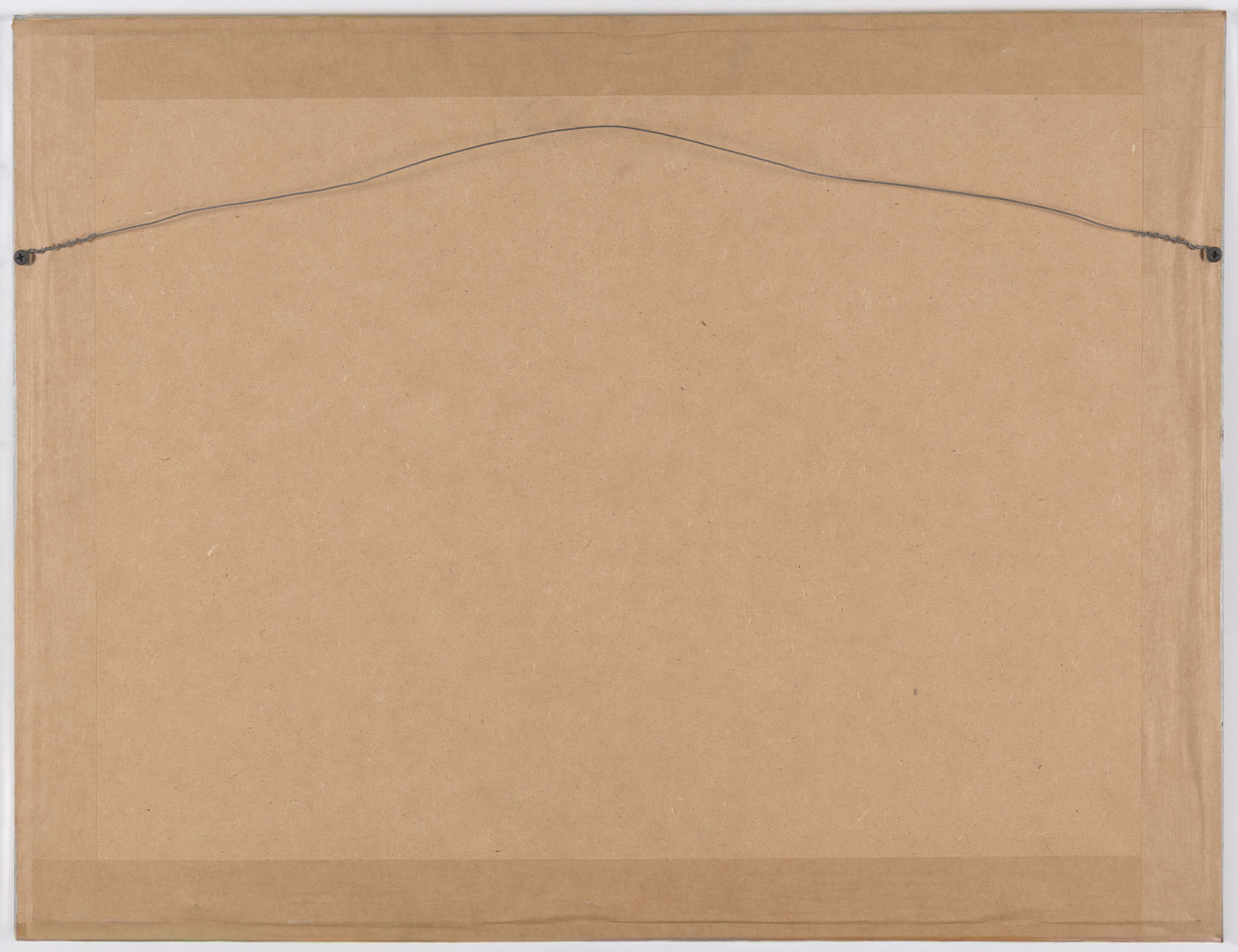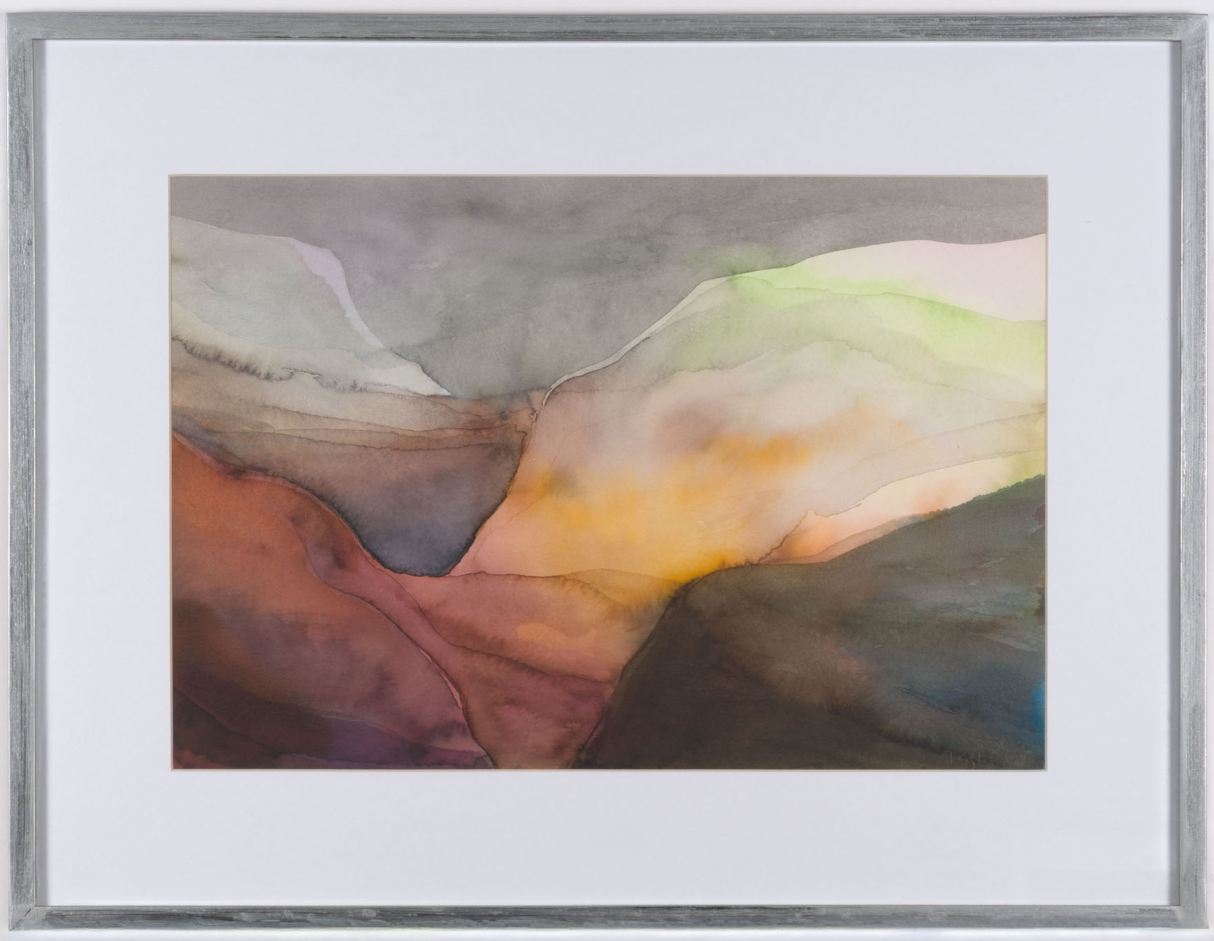 Obra de formato rectangular y orientación horizontal. Composición en base en base a planos de color en superpuestos en degradé. En primer plano, a la izquierda, una sección gris; y, a la derecha, otra violeta. Al centro, tonos amarillos, grises y verdes. El fondo es gris.