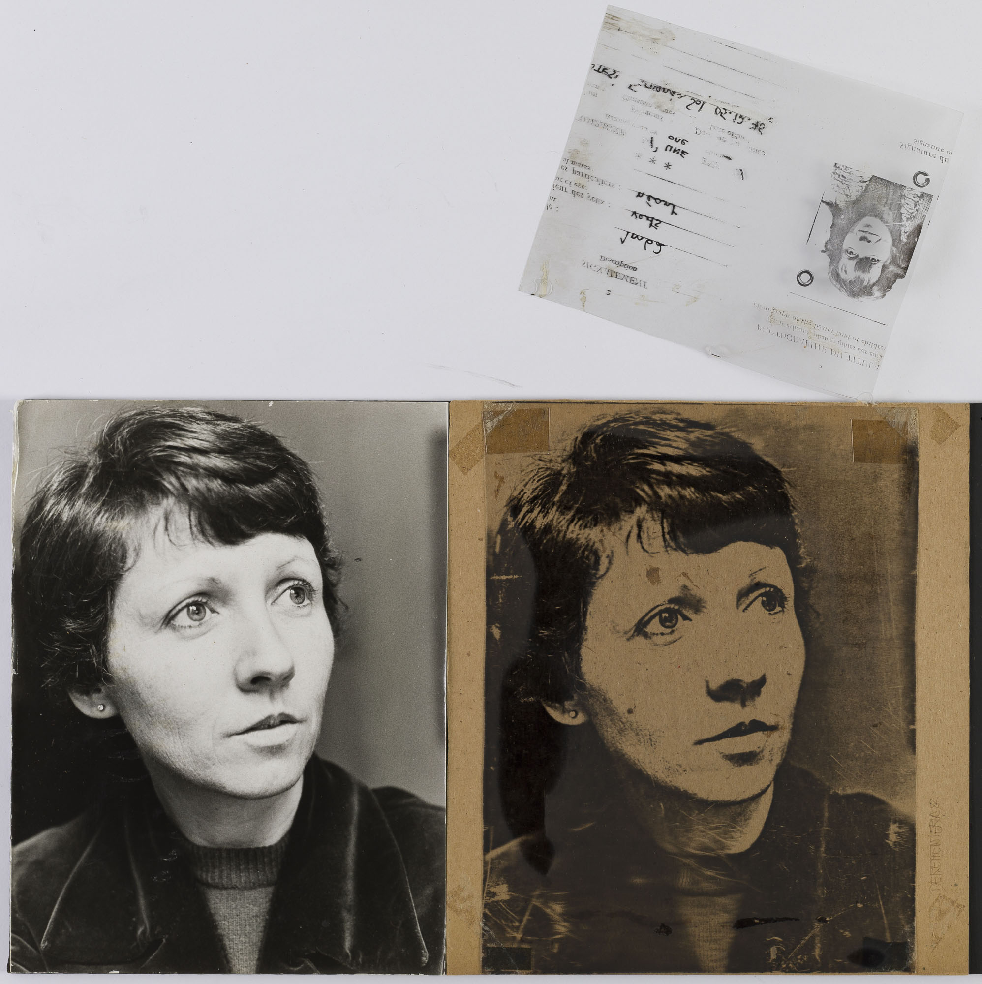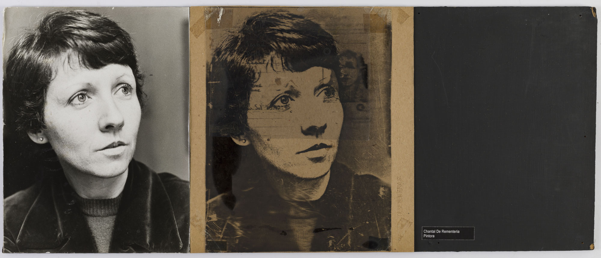 Fotografía en blanco y negro, de formato horizontal. Composición en base a díptico con dos retratos idénticos de una figura femenina de busto. La mujer viste chaqueta, suéter oscuro y dirige la mirada a la derecha. En la segunda imagen se observa una intervención en papel y en mica con la imagen de la retratada. Sobre esta se encuentran textos y figuras que abarcan toda la superficie. El fondo es semi oscuro y la ilumianción es frontal.