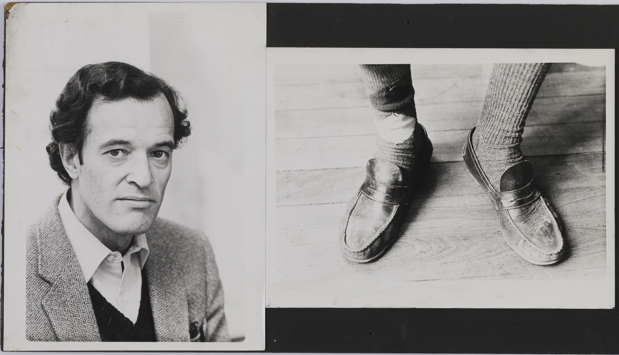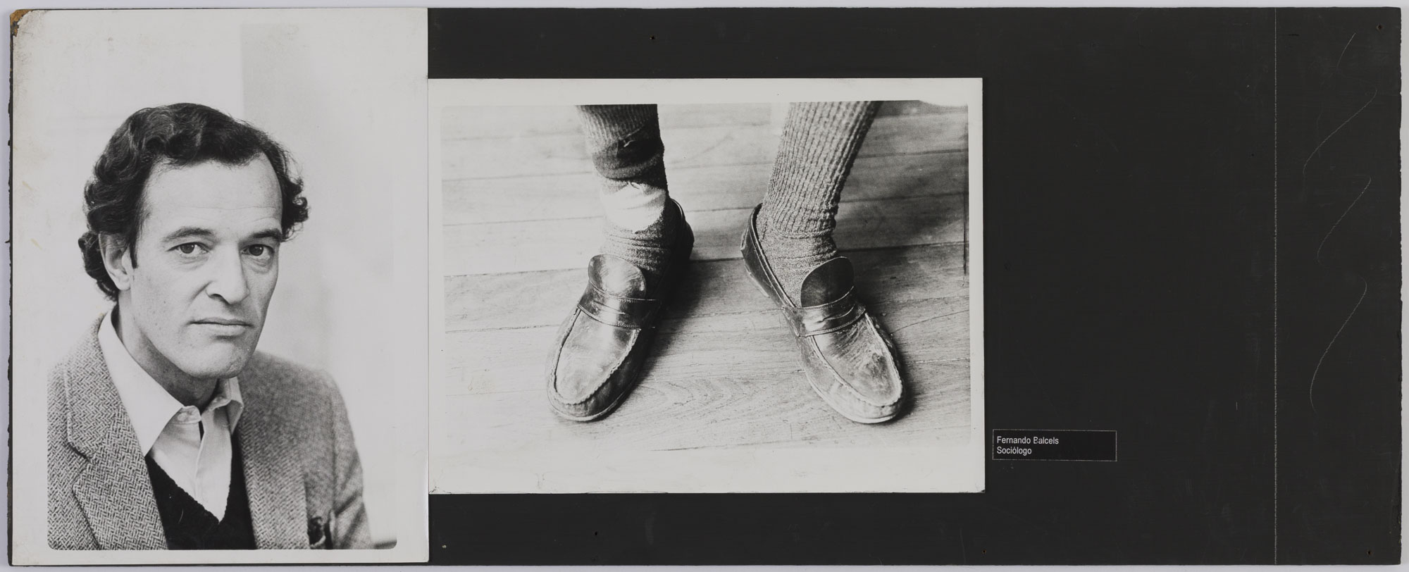 Fotografía en blanco y negro, de formato horizontal. Composición en base a díptico con dos imágenes distintas. En la primera se observa un retrato de una figura masculina de medio cuerpo, con chaqueta, camisa y mirada al frente. En la segunda imagen se muestran los pies de la misma persona, con calzado oscuro y clacetines desiguales en cuanto a diseño. El fondo es claro y la iluminación es uniforme.