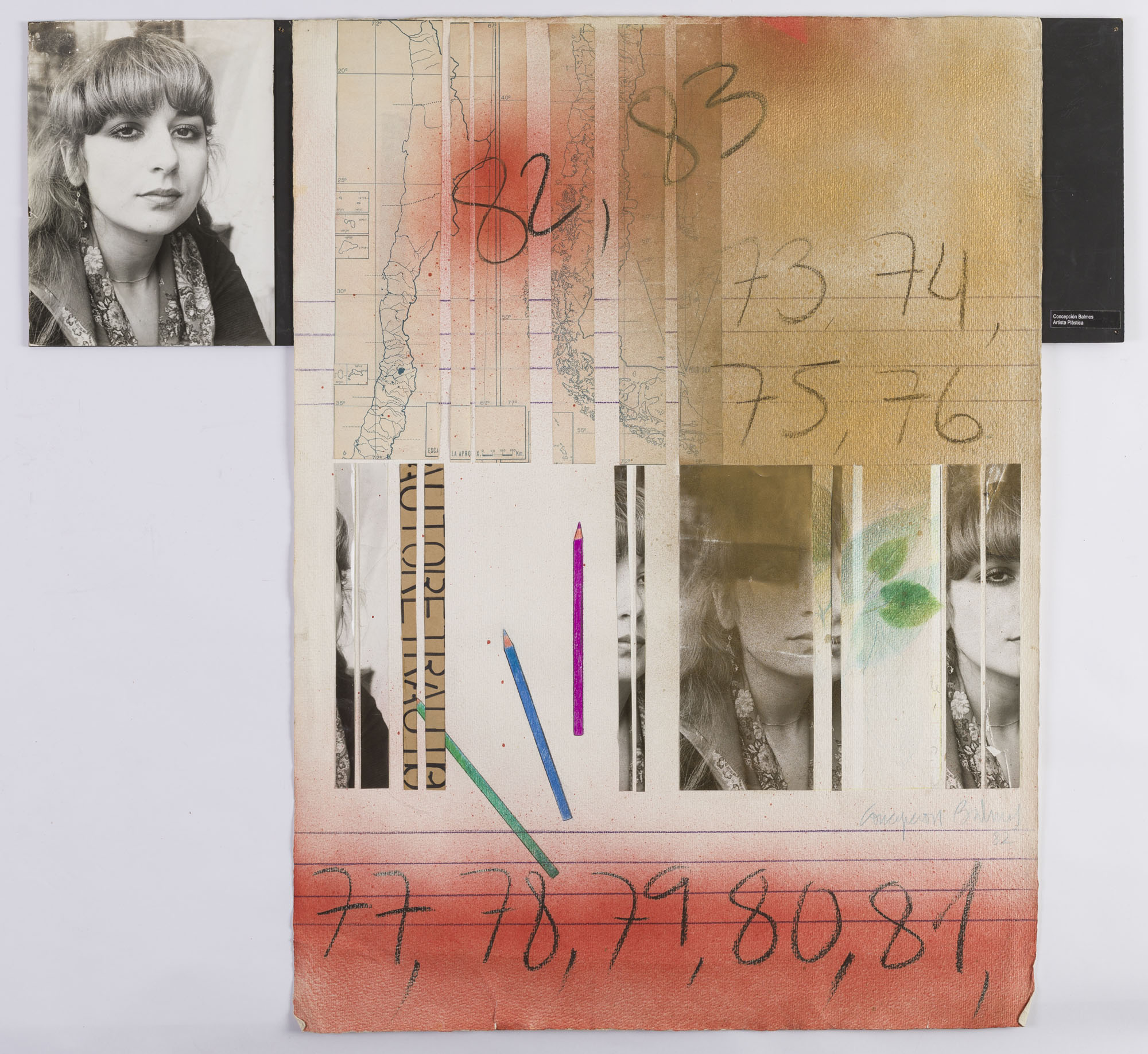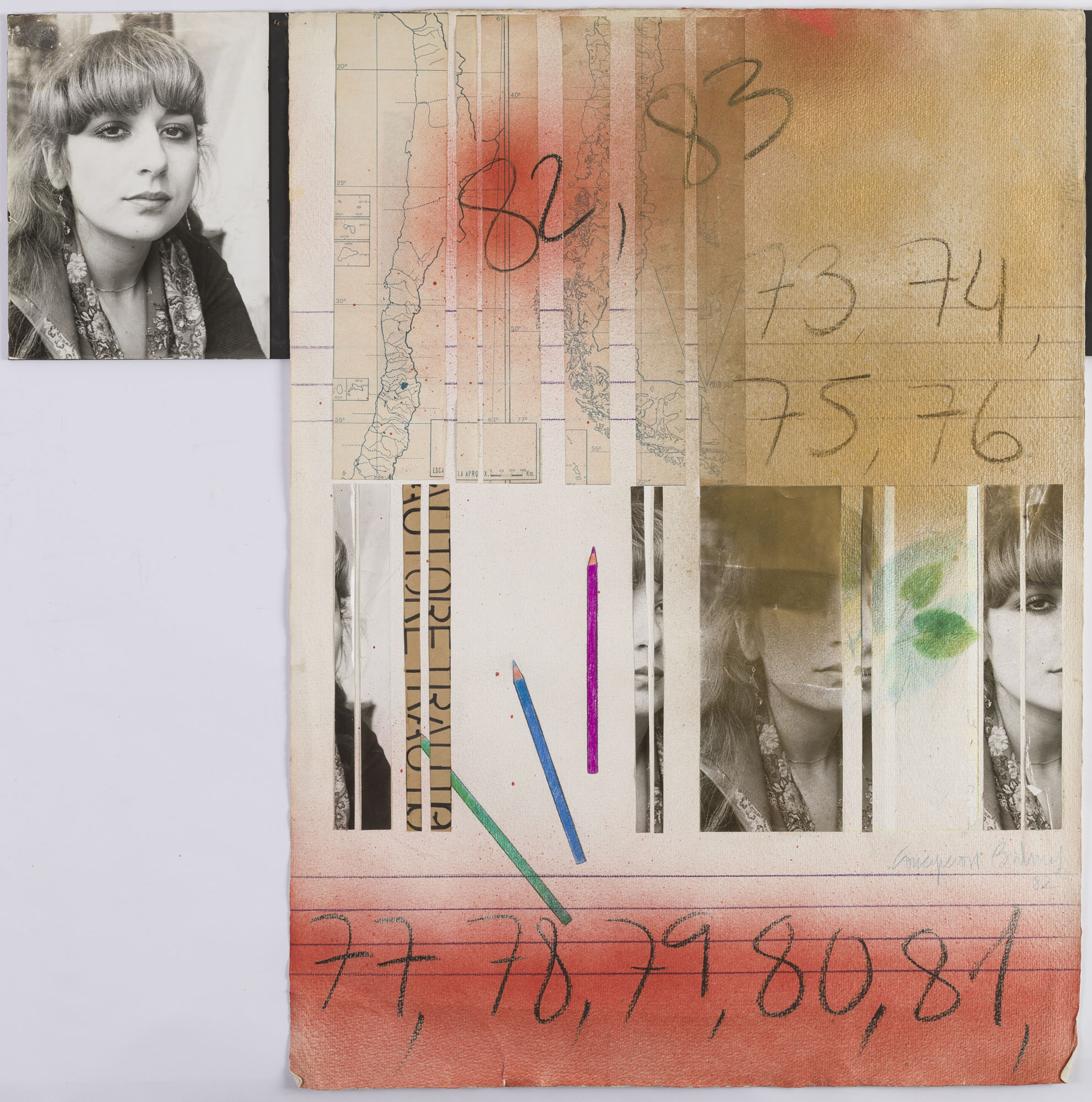 Fotografía en blanco y negro, de formato horizontal. Composición en base a díptico con dos retratos de una figura femenina de busto. La mujer viste chaqueta oscura, pañuelo al cuello y dirige la mirada al frente. En la segunda imagen se observa una intervención que recorta, duplica y distribuye la fotografía sobre una superficie neutra con figuras variadas, En la zona inferior y superior se alojan manchas de color amarillo y rojo, con figuras y números de todos oscuros.