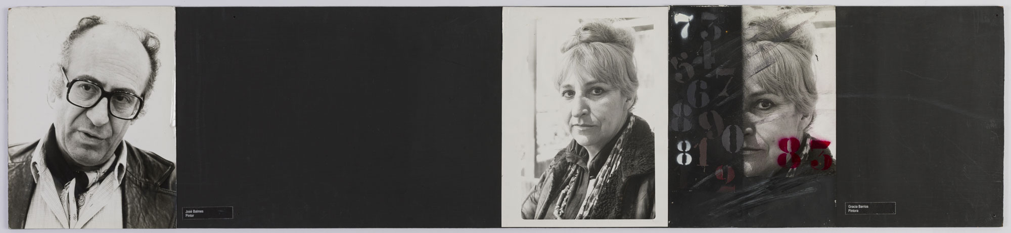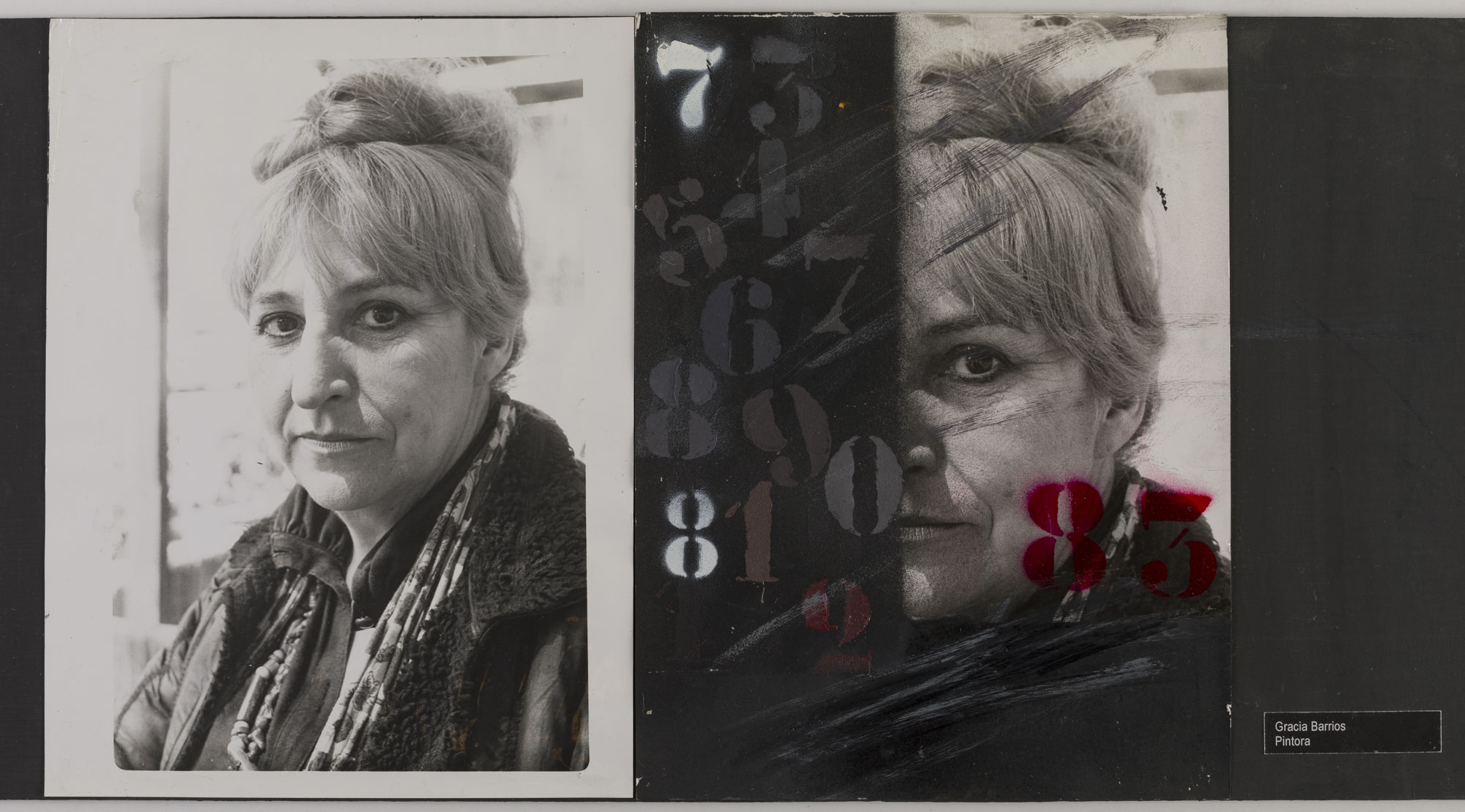 Fotografía en blanco y negro, de formato horizontal. Composición en base a díptico con dos copias del mismo retrato de una figura femenina de medio cuerpo. La mujer mira al frente, vistiendo un abrigo y un pañuelo. En la segunda imagen se observa una capa negra que cubre la mitad del rostro, intervenida por gráficas numerológicas de color negro y rojo. La iluminación es frontal y el fonto es claro.