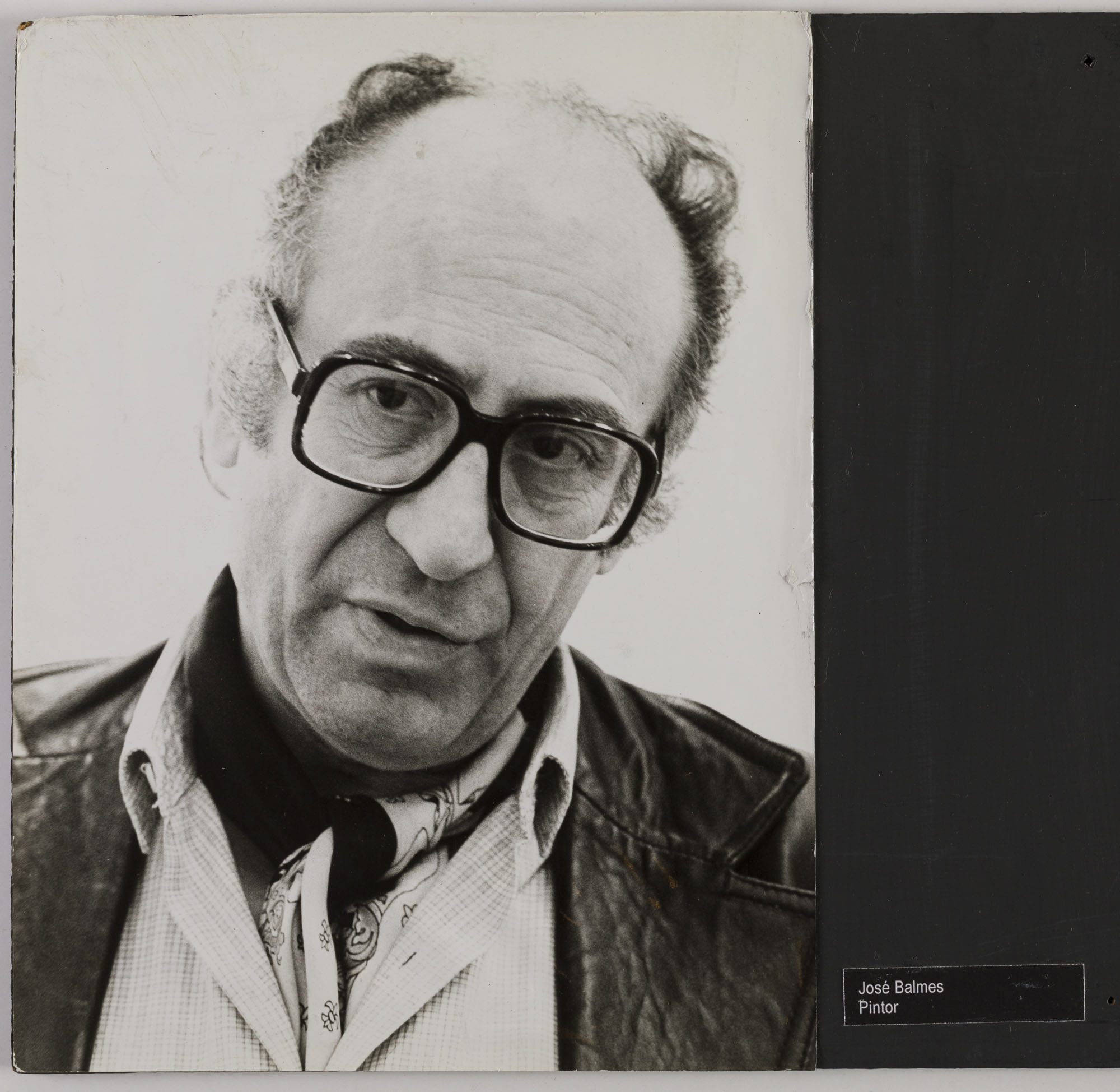 Fotografía en blanco y negro, de formato vertical. Composición en base a retrato de figura masculina de busto. El hombre inclina levemente la cabeza hacia un costado y mira al frente. Viste camisa, chaqueta, un pañuelo anudado al cuello, y lleva anteojos de marco oscuro. El fondo es claro y uniforme, con iluminación frontal.