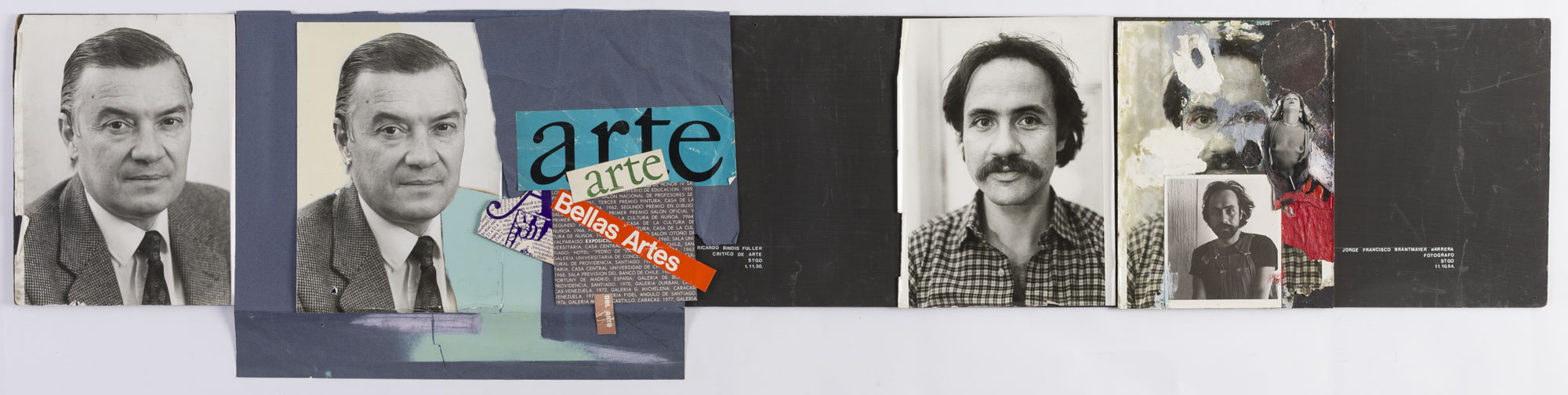 Fotografía en blanco y negro, de formato horizontal. Composición en base a díptico con dos copias de un mismo retrato de una figura masculina de busto. El hombre viste chaqueta oscura, camisa clara, corbata oscura y dirige la mirada al frente. En la segunda imagen se observa una intervención en parche de palabras y textos variados. El fondo es reemplazado por azul, y los parches son de las tonalidades azul, verde, rojo, blanco y negro. El fondo es claro y la iluminación es frontal.